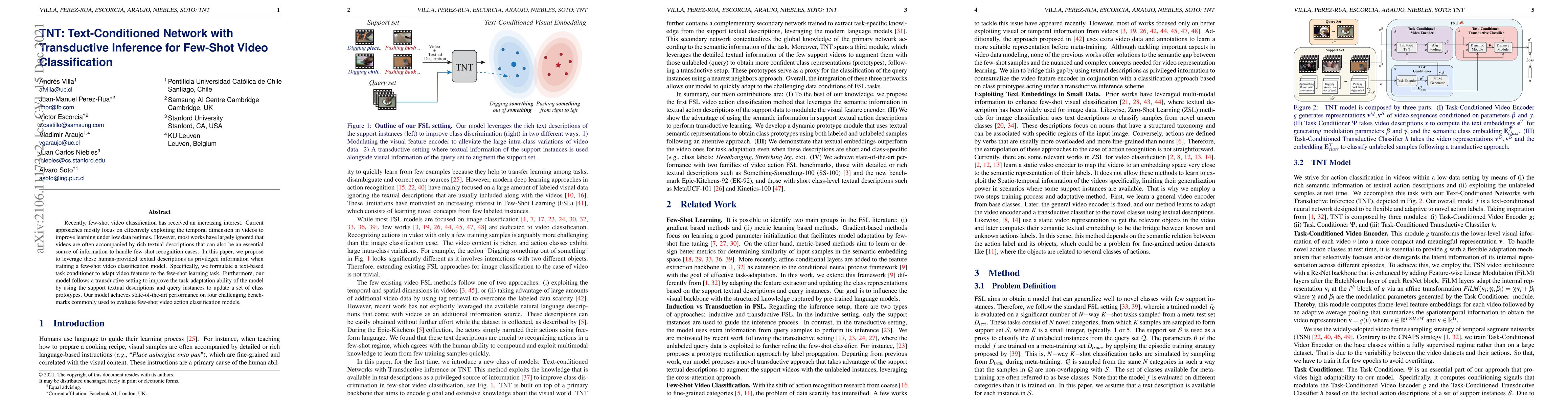The paper proposes a Text-Conditioned Network (TNT) that uses human-provided textual descriptions to enhance few-shot video classification performance. The model employs a text-based task conditioner and a transductive inference approach to refine class prototypes, achieving top results on several benchmarks.