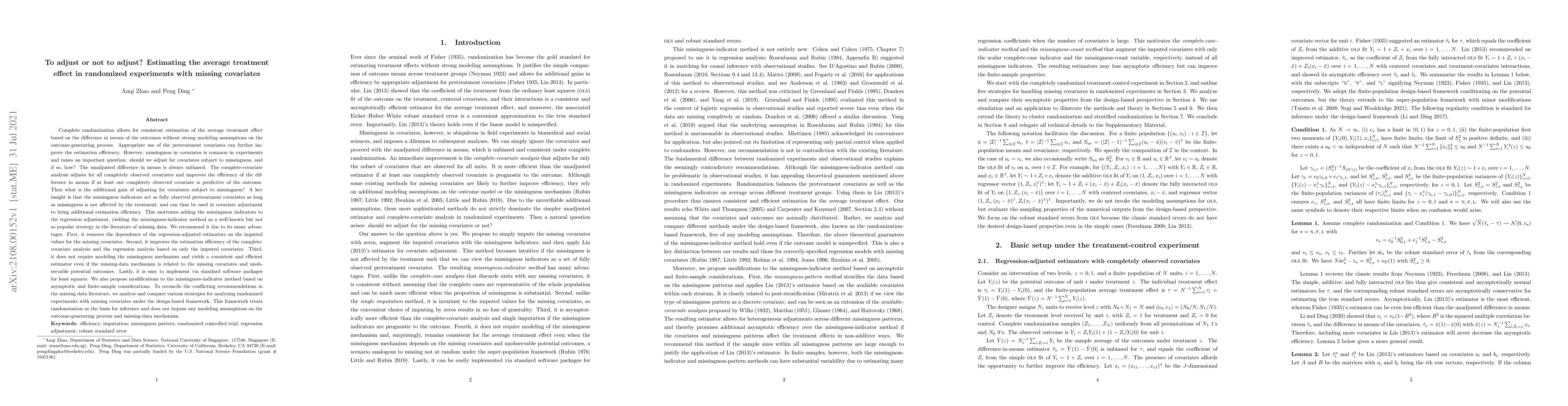 Complete randomization allows for consistent estimation of the average treatment effect based on the difference in means of the outcomes without strong modeling assumptions on the outcome-generating process. Appropriate use of the pretreatment covariates can further improve the estimation efficiency. However, missingness in covariates is common in experiments and raises an important question: should we adjust for covariates subject to missingness, and if so, how? The unadjusted difference in means is always unbiased. The complete-covariate analysis adjusts for all completely observed covariates and improves the efficiency of the difference in means if at least one completely observed covariate is predictive of the outcome. Then what is the additional gain of adjusting for covariates subject to missingness? A key insight is that the missingness indicators act as fully observed pretreatment covariates as long as missingness is not affected by the treatment, and can thus be used in covariate adjustment to bring additional estimation efficiency. This motivates adding the missingness indicators to the regression adjustment, yielding the missingness-indicator method as a well-known but not so popular strategy in the literature of missing data. We recommend it due to its many advantages. We also propose modifications to the missingness-indicator method based on asymptotic and finite-sample considerations. To reconcile the conflicting recommendations in the missing data literature, we analyze and compare various strategies for analyzing randomized experiments with missing covariates under the design-based framework. This framework treats randomization as the basis for inference and does not impose any modeling assumptions on the outcome-generating process and missing-data mechanism.