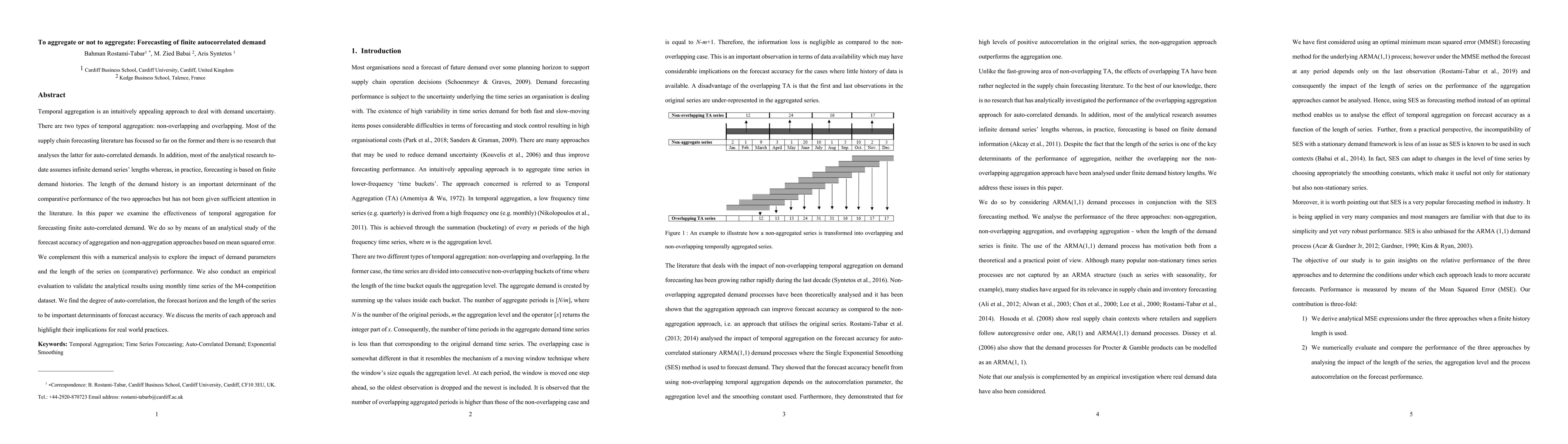 This paper analyzes the effectiveness of temporal aggregation for forecasting finite auto-correlated demand, contrasting non-overlapping and overlapping approaches. Key findings include the importance of auto-correlation, forecast horizon, and series length on forecast accuracy, supported by analytical, numerical, and empirical evaluations.
