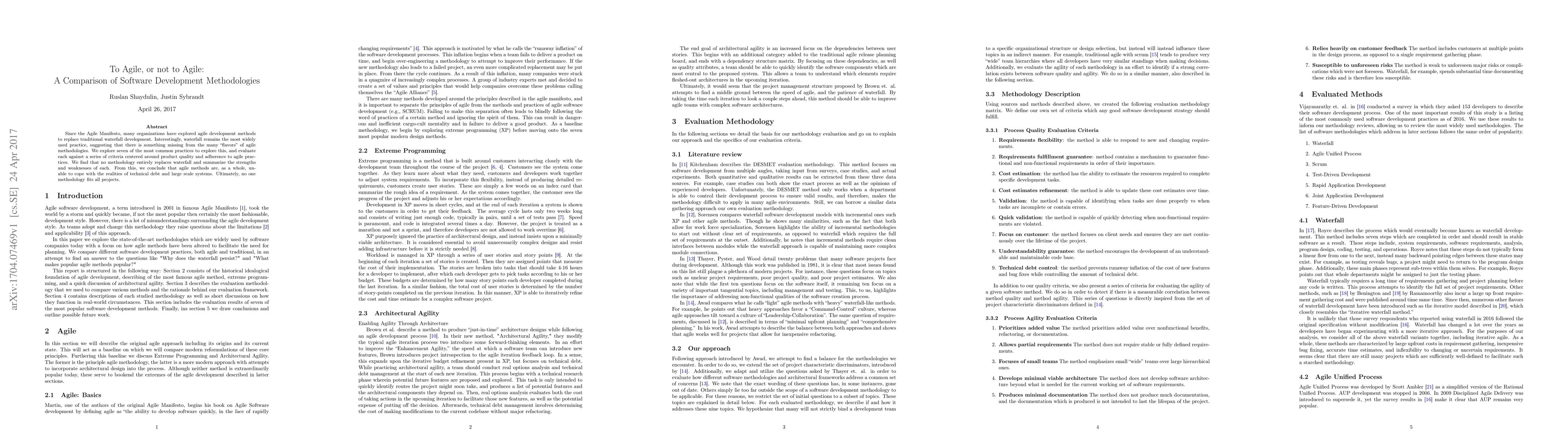 This paper compares seven common agile software development methodologies against traditional waterfall practices, finding that none fully replace waterfall due to challenges with technical debt and large-scale systems. It concludes that while agile methods have strengths, they are not universally effective across all projects.