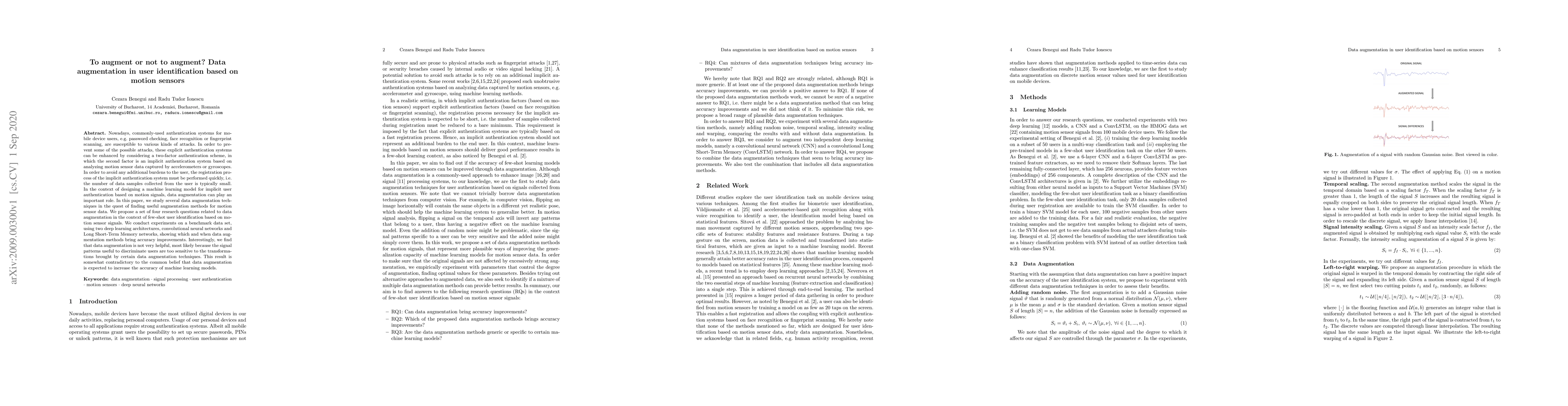 Nowadays, commonly-used authentication systems for mobile device users, e.g. password checking, face recognition or fingerprint scanning, are susceptible to various kinds of attacks. In order to prevent some of the possible attacks, these explicit authentication systems can be enhanced by considering a two-factor authentication scheme, in which the second factor is an implicit authentication system based on analyzing motion sensor data captured by accelerometers or gyroscopes. In order to avoid any additional burdens to the user, the registration process of the implicit authentication system must be performed quickly, i.e. the number of data samples collected from the user is typically small. In the context of designing a machine learning model for implicit user authentication based on motion signals, data augmentation can play an important role. In this paper, we study several data augmentation techniques in the quest of finding useful augmentation methods for motion sensor data. We propose a set of four research questions related to data augmentation in the context of few-shot user identification based on motion sensor signals. We conduct experiments on a benchmark data set, using two deep learning architectures, convolutional neural networks and Long Short-Term Memory networks, showing which and when data augmentation methods bring accuracy improvements. Interestingly, we find that data augmentation is not very helpful, most likely because the signal patterns useful to discriminate users are too sensitive to the transformations brought by certain data augmentation techniques. This result is somewhat contradictory to the common belief that data augmentation is expected to increase the accuracy of machine learning models.