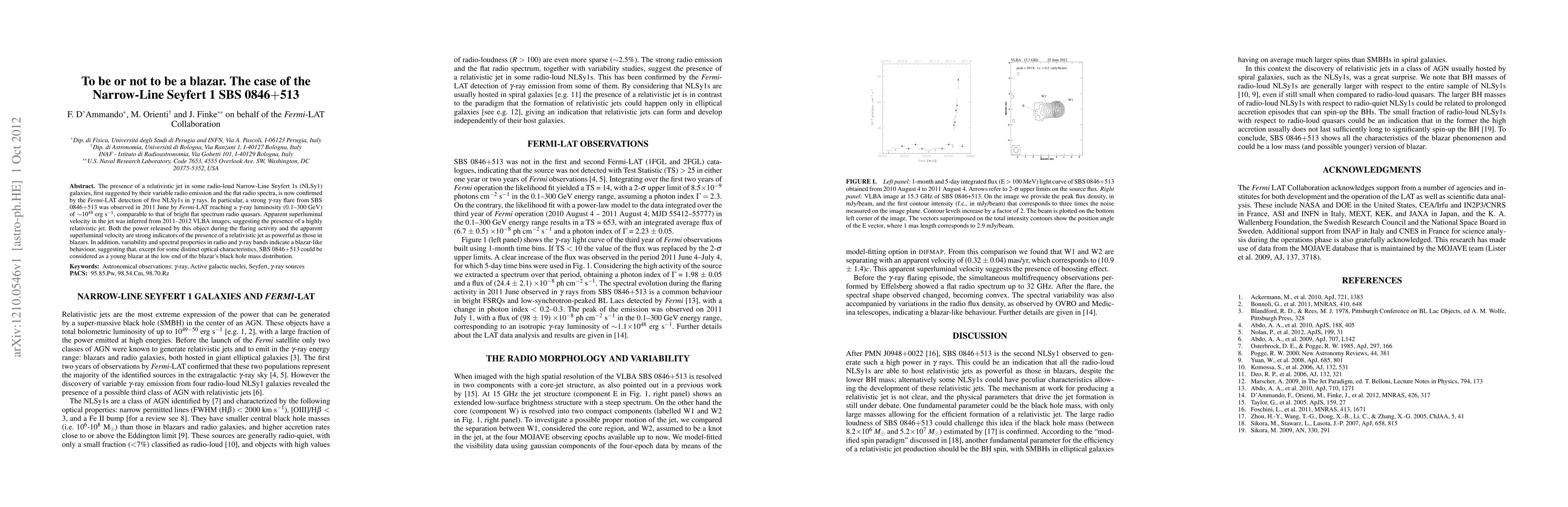 The presence of a relativistic jet in some radio-loud Narrow-Line Seyfert 1s (NLSy1) galaxies, first suggested by their variable radio emission and the flat radio spectra, is now confirmed by the Fermi-LAT detection of five NLSy1s in gamma rays. In particular, a strong gamma-ray flare from SBS 0846+513 was observed in 2011 June by Fermi-LAT reaching a gamma-ray luminosity (0.1-300 GeV) of about 10^48 erg/s, comparable to that of bright flat spectrum radio quasars. Apparent superluminal velocity in the jet was inferred from 2011-2012 VLBA images, suggesting the presence of a highly relativistic jet. Both the power released by this object during the flaring activity and the apparent superluminal velocity are strong indicators of the presence of a relativistic jet as powerful as those in blazars. In addition, variability and spectral properties in radio and gamma-ray bands indicate a blazar-like behaviour, suggesting that, except for some distinct optical characteristics, SBS 0846+513 could be considered as a young blazar at the low end of the blazar's black hole mass distribution.