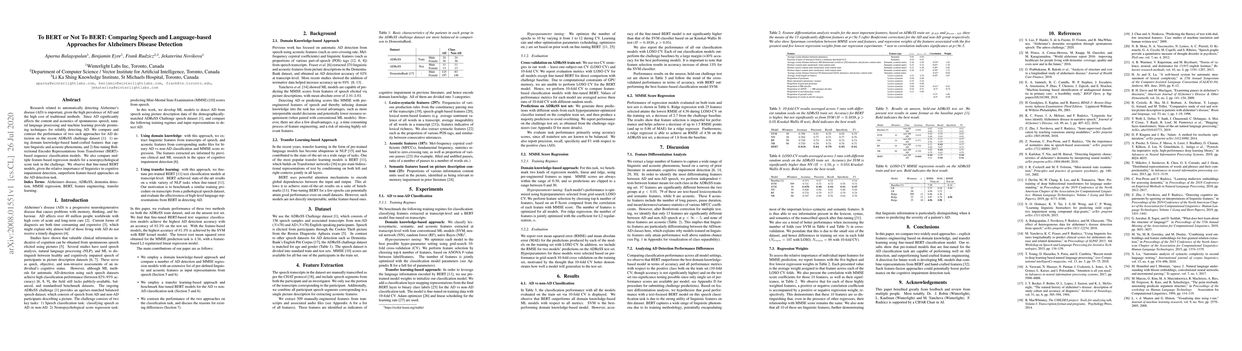 This paper compares two approaches for detecting Alzheimer's disease: hand-crafted feature-based methods and fine-tuned BERT models. Results show that BERT models outperform traditional methods, highlighting the importance of linguistic features in cognitive impairment detection.