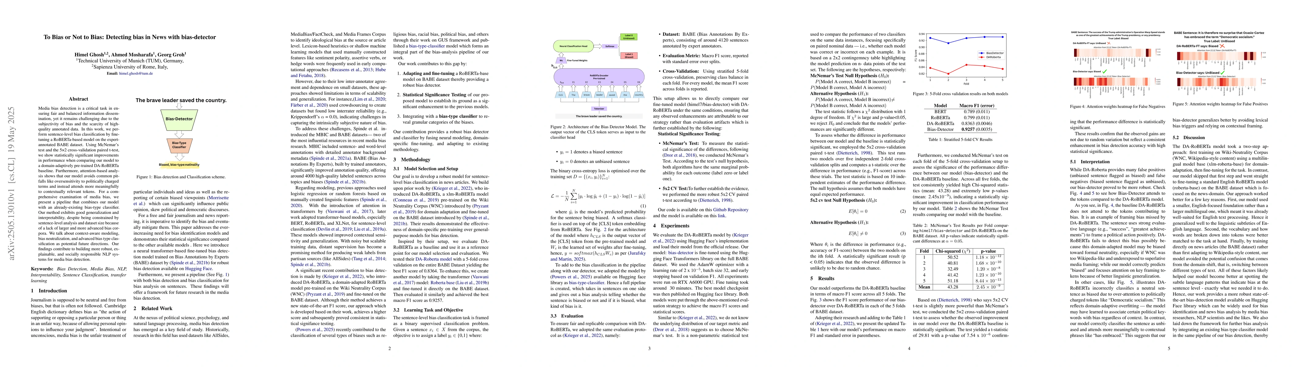 The research fine-tunes a RoBERTa-based model on the BABE dataset for sentence-level bias classification, comparing it to a domain-adaptively pre-trained DA-RoBERTa baseline using McNemar's test and 5x2 cross-validation paired t-test.