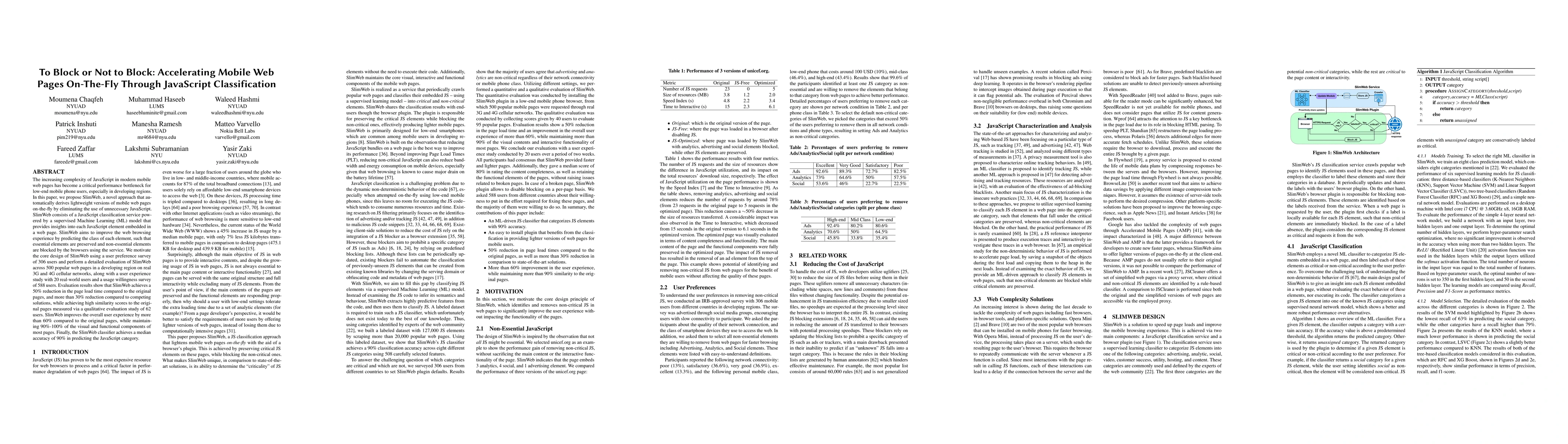 SlimWeb proposes a machine learning-based approach to automatically generate lightweight versions of mobile web pages by eliminating unnecessary JavaScript, significantly reducing load times and improving user experience, especially for low-end mobile devices in developing regions. Evaluations show a 50% reduction in load time and a 60% improvement in user experience, with a 90% median accuracy in JavaScript classification.