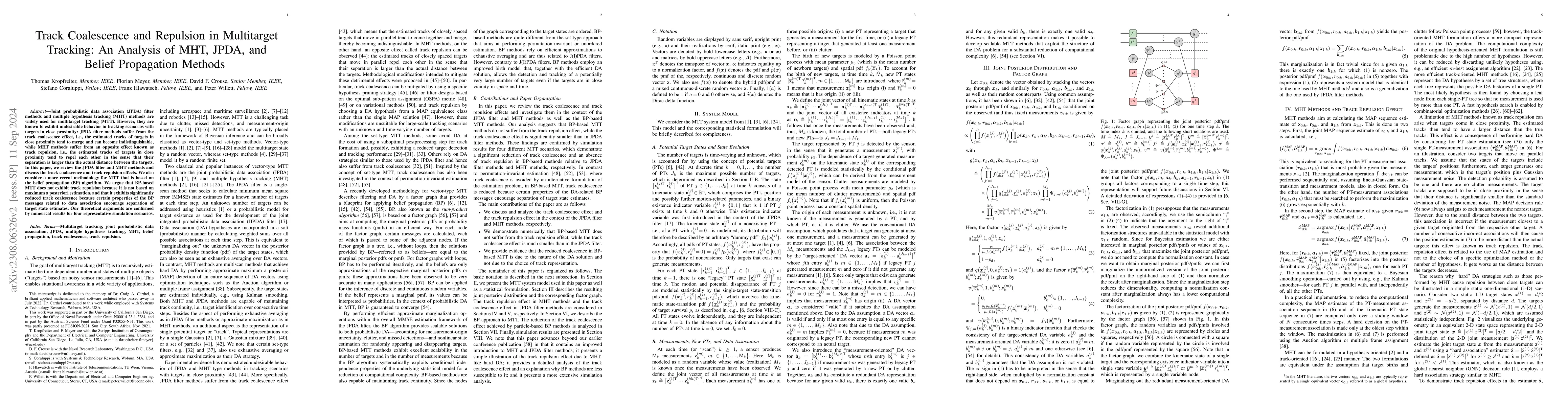 This paper reviews multitarget tracking methods, specifically JPDA filters, MHT, and belief propagation, highlighting the track coalescence and repulsion issues. It argues that belief propagation reduces coalescence and eliminates repulsion, supported by theoretical and numerical results.