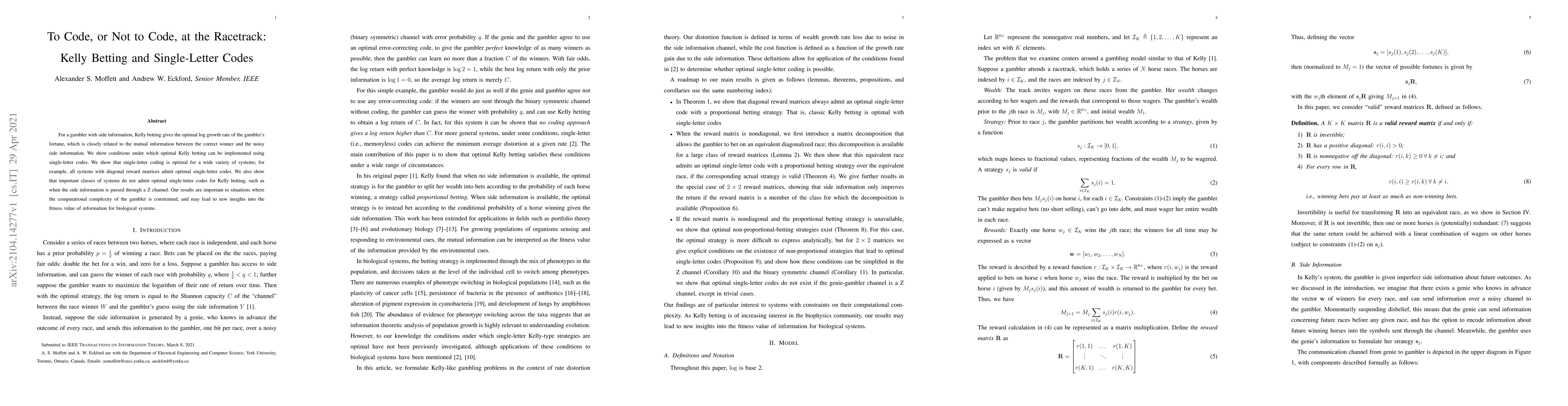 For a gambler with side information, Kelly betting gives the optimal log growth rate of the gambler's fortune, which is closely related to the mutual information between the correct winner and the noisy side information. We show conditions under which optimal Kelly betting can be implemented using single-letter codes. We show that single-letter coding is optimal for a wide variety of systems; for example, all systems with diagonal reward matrices admit optimal single-letter codes. We also show that important classes of systems do not admit optimal single-letter codes for Kelly betting, such as when the side information is passed through a Z channel. Our results are important to situations where the computational complexity of the gambler is constrained, and may lead to new insights into the fitness value of information for biological systems.