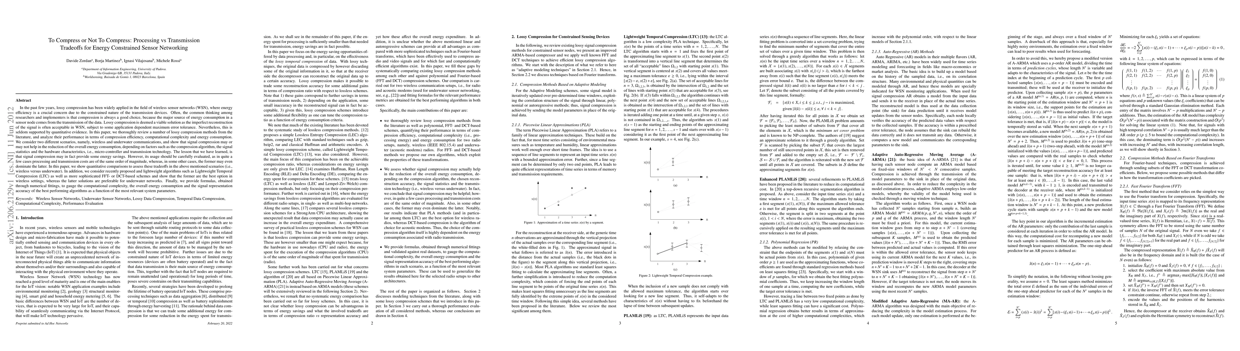 In the past few years, lossy compression has been widely applied in the field of wireless sensor networks (WSN), where energy efficiency is a crucial concern due to the constrained nature of the transmission devices. Often, the common thinking among researchers and implementers is that compression is always a good choice, because the major source of energy consumption in a sensor node comes from the transmission of the data. Lossy compression is deemed a viable solution as the imperfect reconstruction of the signal is often acceptable in WSN. In this paper, we thoroughly review a number of lossy compression methods from the literature, and analyze their performance in terms of compression efficiency, computational complexity and energy consumption. We consider two different scenarios, namely, wireless and underwater communications, and show that signal compression may or may not help in the reduction of the overall energy consumption, depending on factors such as the compression algorithm, the signal statistics and the hardware characteristics, i.e., micro-controller and transmission technology. The lesson that we have learned, is that signal compression may in fact provide some energy savings. However, its usage should be carefully evaluated, as in quite a few cases processing and transmission costs are of the same order of magnitude, whereas, in some other cases, the former may even dominate the latter. In this paper, we show quantitative comparisons to assess these tradeoffs in the above mentioned scenarios. Finally, we provide formulas, obtained through numerical fittings, to gauge computational complexity, overall energy consumption and signal representation accuracy for the best performing algorithms as a function of the most relevant system parameters.