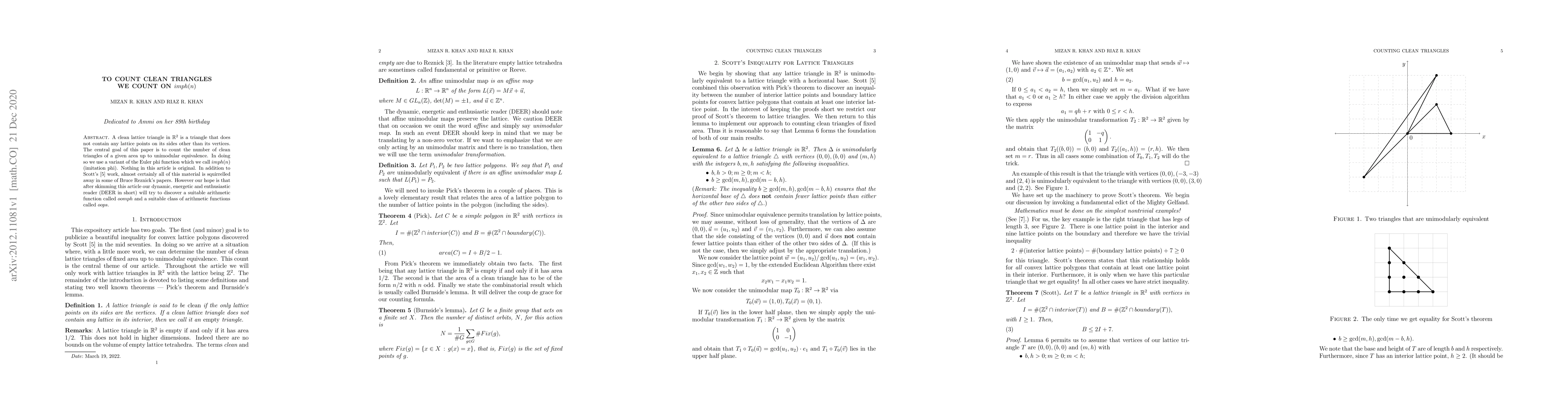 A clean lattice triangle in ${\mathbb R}^2$ is a triangle that does not contain any lattice points on its sides other than its vertices. The central goal of this paper is to count the number of clean triangles of a given area up to unimodular equivalence. In doing so we use a variant of the Euler phi function which we call $imph(n)$ (imitation phi).