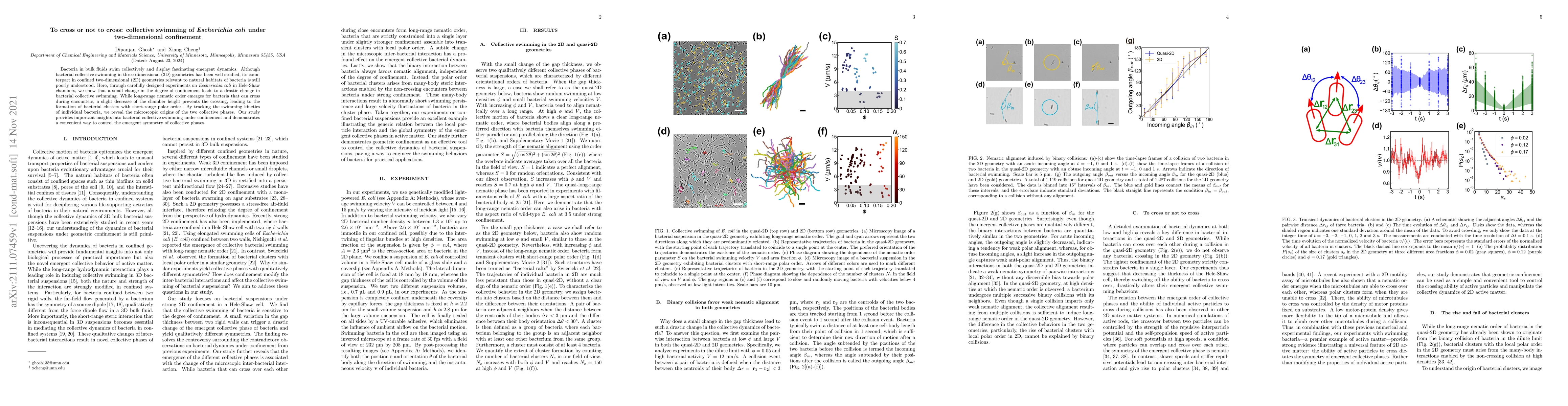 This study investigates the collective swimming dynamics of Escherichia coli in two-dimensional confinement, revealing that slight changes in confinement lead to either long-range nematic order or short-range polar clusters. The research highlights the microscopic mechanisms behind these emergent collective phases and offers insights into controlling bacterial swimming behavior.