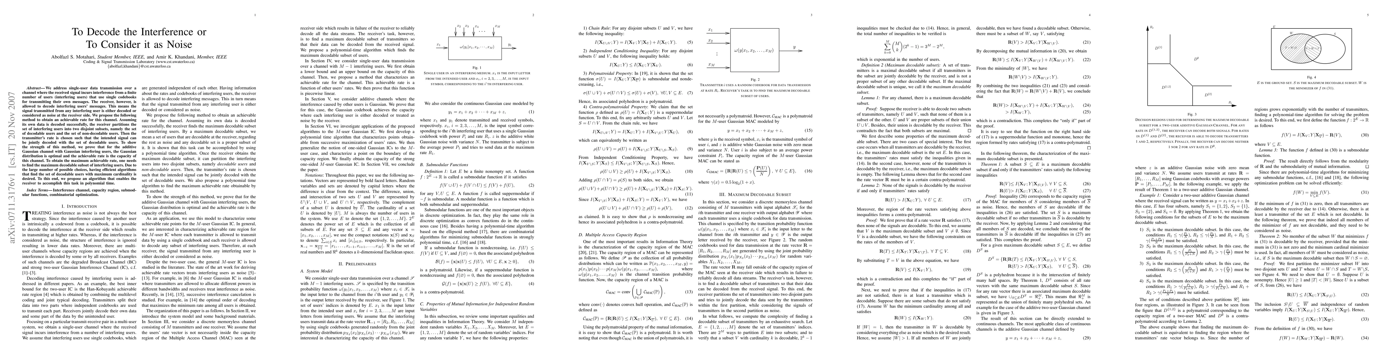 We address single-user data transmission over a channel where the received signal incurs interference from a finite number of users (interfering users) that use single codebooks for transmitting their own messages. The receiver, however, is allowed to decode interfering users' messages. This means the signal transmitted from any interfering user is either decoded or considered as noise at the receiver side. We propose the following method to obtain an achievable rate for this channel. Assuming its own data is decoded successfully, the receiver partitions the set of interfering users into two disjoint subsets, namely the set of decodable users and the set of non-decodable users. Then the transmitter's rate is chosen such that the intended signal can be jointly decoded with the set of decodable users. To show the strength of this method, we prove that for the additive Gaussian channel with Gaussian interfering users, the Gaussian distribution is optimal and the achievable rate is the capacity of this channel. To obtain the maximum achievable rate, one needs to find the maximum decodable subset of interfering users. Due to the large number of possible choices, having efficient algorithms that find the set of decodable users with maximum cardinality is desired. To this end, we propose an algorithm that enables the receiver to accomplish this task in polynomial time.