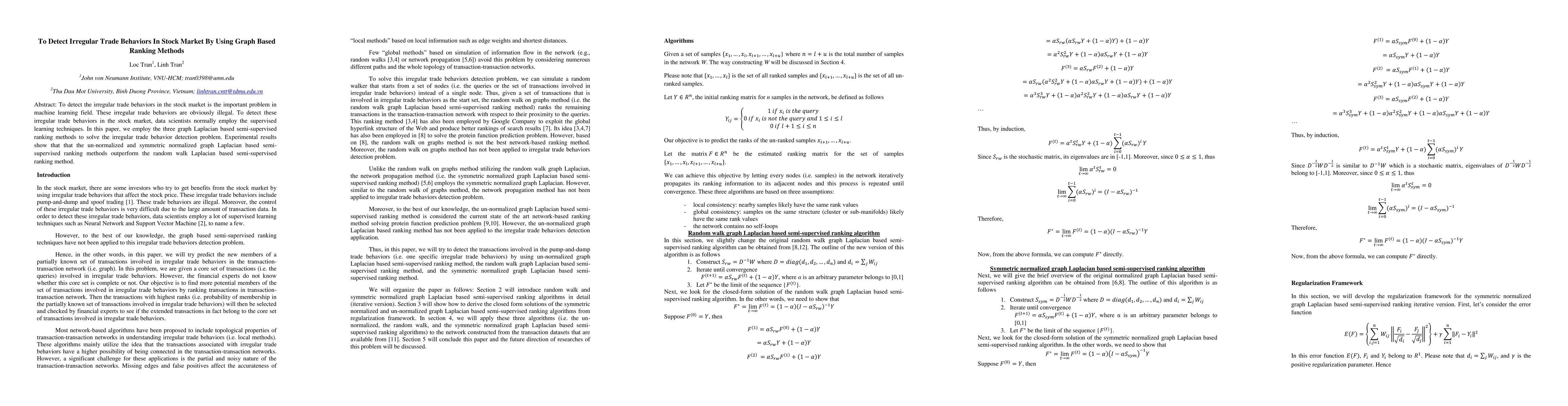 This paper proposes the use of graph Laplacian based semi-supervised ranking methods to detect irregular and illegal trade behaviors in the stock market. Experimental results indicate that un-normalized and symmetric normalized graph Laplacian methods outperform the random walk Laplacian method in this task.