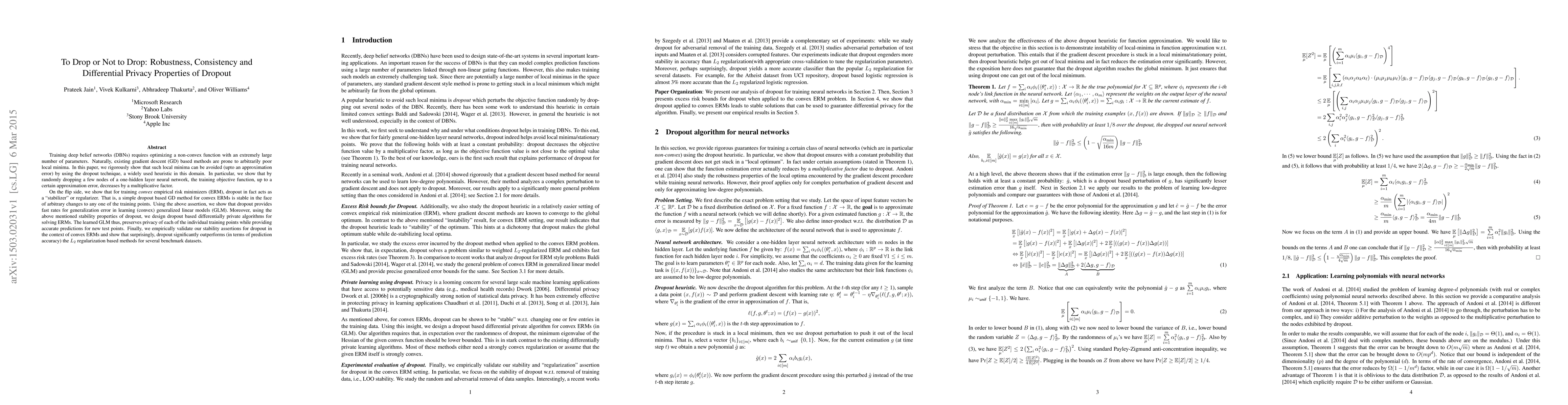 This paper shows that dropout can avoid poor local minima in deep learning and provide fast generalization rates for convex generalized linear models, while also designing differentially private algorithms for empirical risk minimizers.