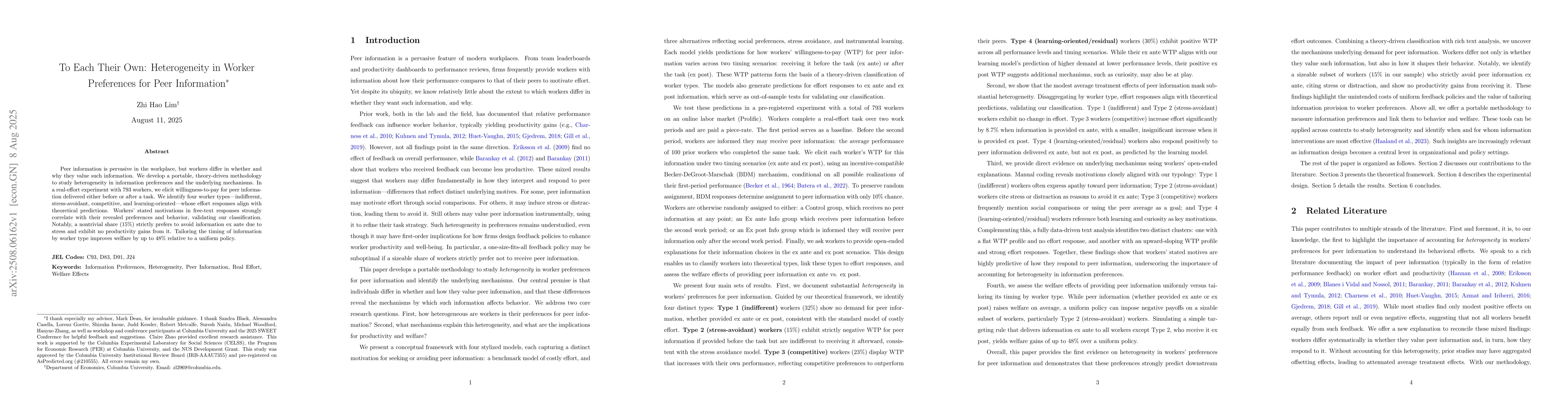 Peer information is pervasive in the workplace, but workers differ in whether and why they value such information. We develop a portable, theory-driven methodology to study heterogeneity in information preferences and the underlying mechanisms. In a real-effort experiment with 793 workers, we elicit willingness-to-pay for peer information delivered either before or after a task. We identify four worker types (indifferent, stress-avoidant, competitive, and learning-oriented) whose effort responses align with theoretical predictions. Workers' stated motivations in free-text responses strongly correlate with their revealed preferences and behavior, validating our classification. Notably, a nontrivial share (15%) strictly prefers to avoid information ex ante due to stress and exhibit no productivity gains from it. Tailoring the timing of information by worker type improves welfare by up to 48% relative to a uniform policy.