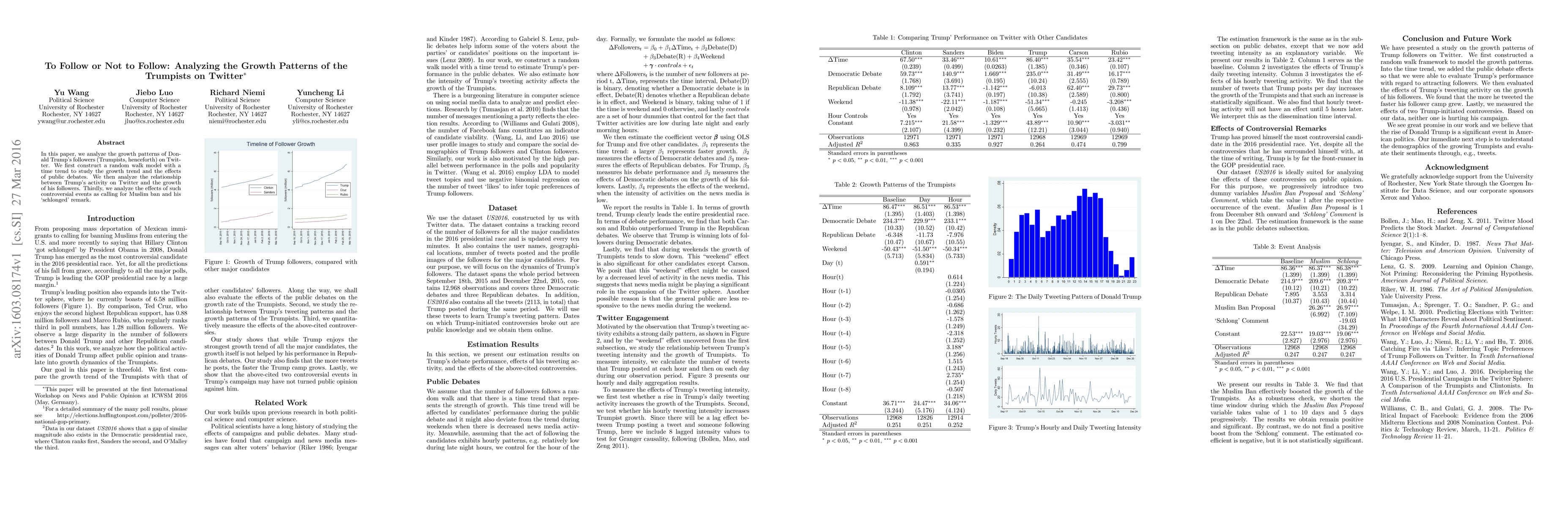 This paper analyzes the growth patterns of Donald Trump's Twitter followers, finding that public debates and controversial events like a Muslim ban can increase follower growth. The study uses a random walk model to track Trump's online activity and its impact on his follower base.