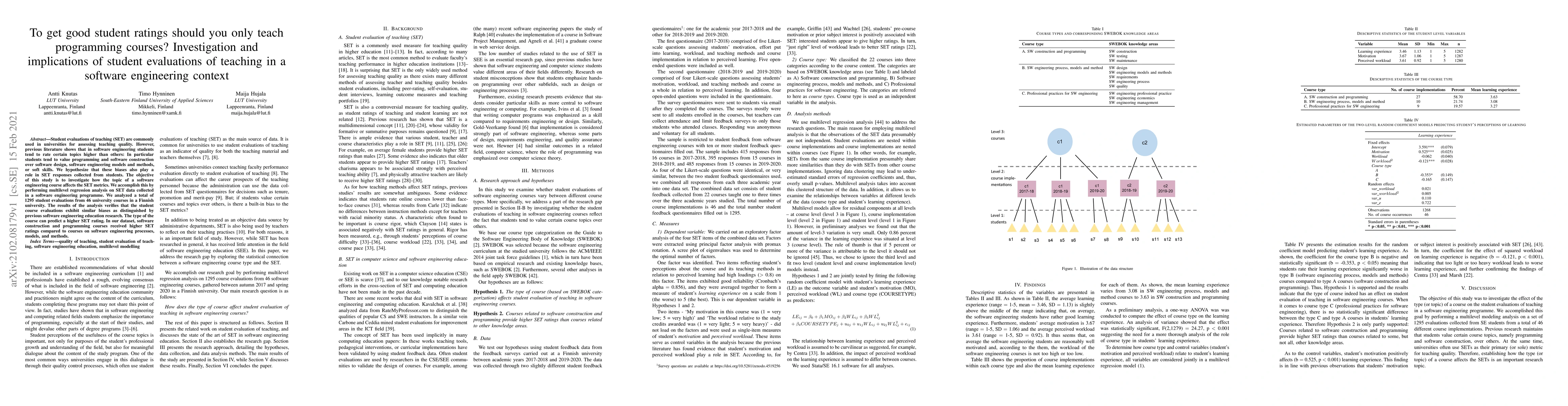 Student evaluations of teaching (SET) are commonly used in universities for assessing teaching quality. However, previous literature shows that in software engineering students tend to rate certain topics higher than others: In particular students tend to value programming and software construction over software design, software engineering models and methods, or soft skills. We hypothesize that these biases also play a role in SET responses collected from students. The objective of this study is to investigate how the topic of a software engineering course affects the SET metrics. We accomplish this by performing multilevel regression analysis on SET data collected in a software engineering programme. We analyzed a total of 1295 student evaluations from 46 university courses in a Finnish university. The results of the analysis verifies that the student course evaluations exhibit similar biases as distinguished by previous software engineering education research. The type of the course can predict a higher SET rating. In our dataset, software construction and programming courses received higher SET ratings compared to courses on software engineering processes, models, and methods.