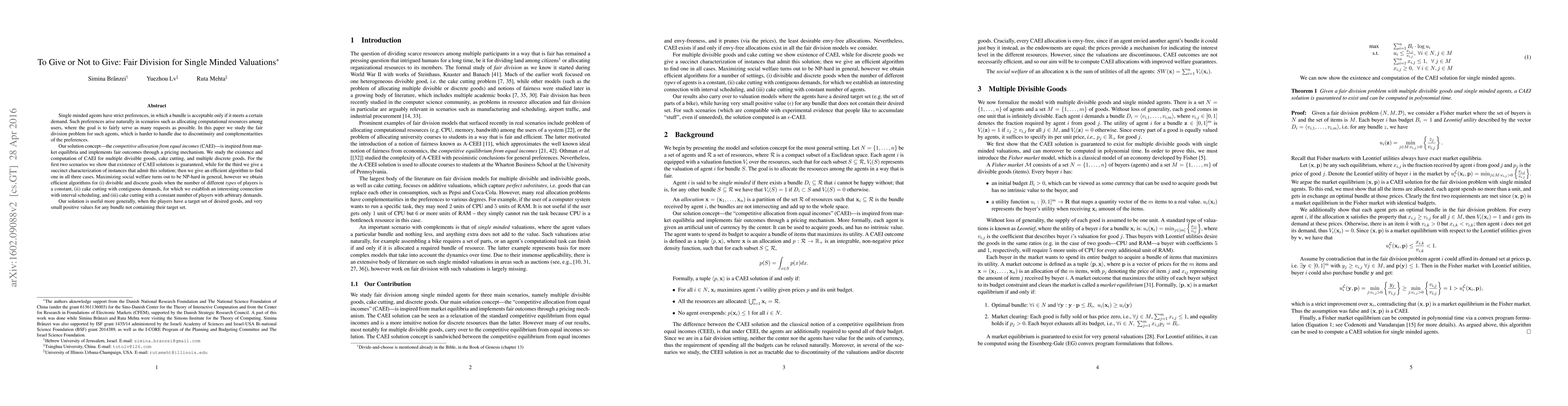 This research introduces the competitive allocation from equal incomes (CAEI) for fairly dividing resources among single-minded agents, who only accept bundles meeting specific demands. CAEI guarantees existence for multiple divisible goods and cake cutting, provides a characterization for discrete goods, and offers efficient algorithms for various scenarios. Maximizing social welfare is NP-hard, but efficient algorithms are provided for specific cases, including constant types of players, contiguous demands, and a constant number of players with arbitrary demands. The solution is broadly applicable when players have target sets of desired goods.