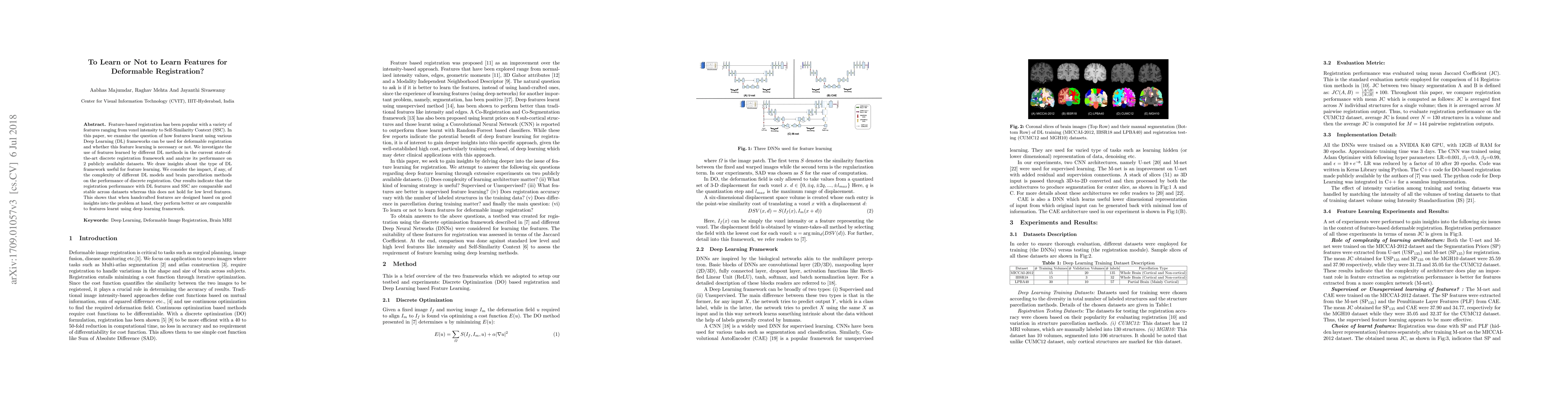 This paper investigates the effectiveness of deep learning features for deformable registration in brain imaging, finding that SSC features outperform low-level features and that performance is stable across datasets.