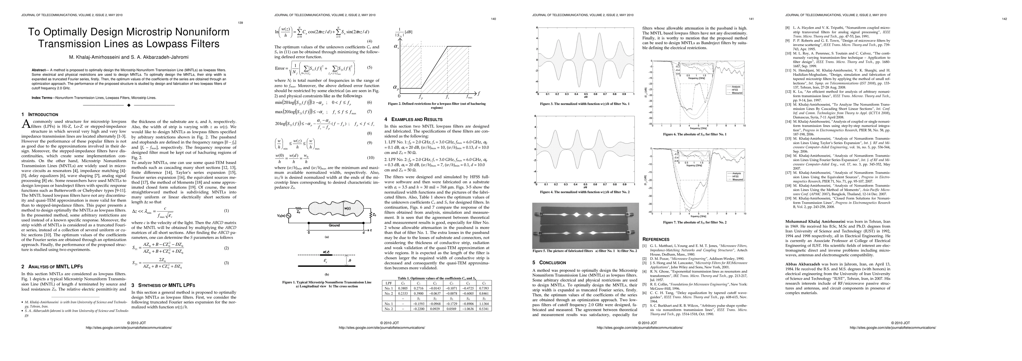 A method is proposed to optimally design the Microstrip Nonuniform Transmission Line (MNTLs) as lowpass filters. Some electrical and physical restrictions are used to design MNTLs. To optimally design the MNTLs, their strip width is expanded as truncated Fourier series, firstly. Then, the optimum values of the coefficients of the series are obtained through an optimization approach. The performance of the proposed structure is studied by design and fabrication of two lowpass filters of cutoff frequency 2.0 GHz.