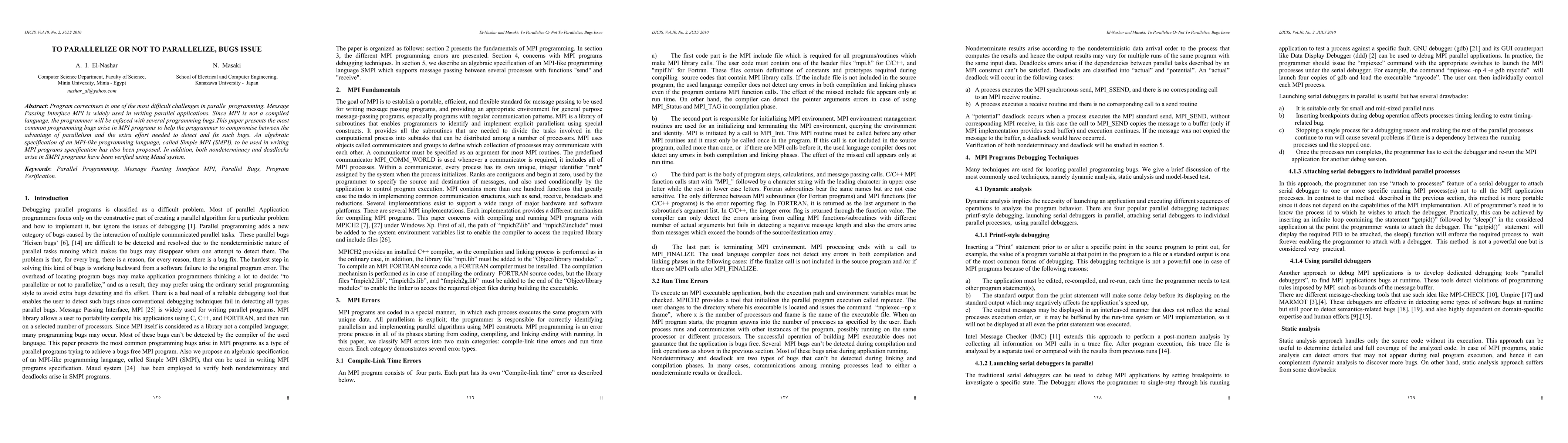 Program correctness is one of the most difficult challenges in parallel programming. Message Passing Interface MPI is widely used in writing parallel applications. Since MPI is not a compiled language, the programmer will be enfaced with several programming bugs.This paper presents the most common programming bugs arise in MPI programs to help the programmer to compromise between the advantage of parallelism and the extra effort needed to detect and fix such bugs. An algebraic specification of an MPI-like programming language, called Simple MPI (SMPI), to be used in writing MPI programs specification has also been proposed. In addition, both nondeterminacy and deadlocks arise in SMPI programs have been verified using Maud system.
