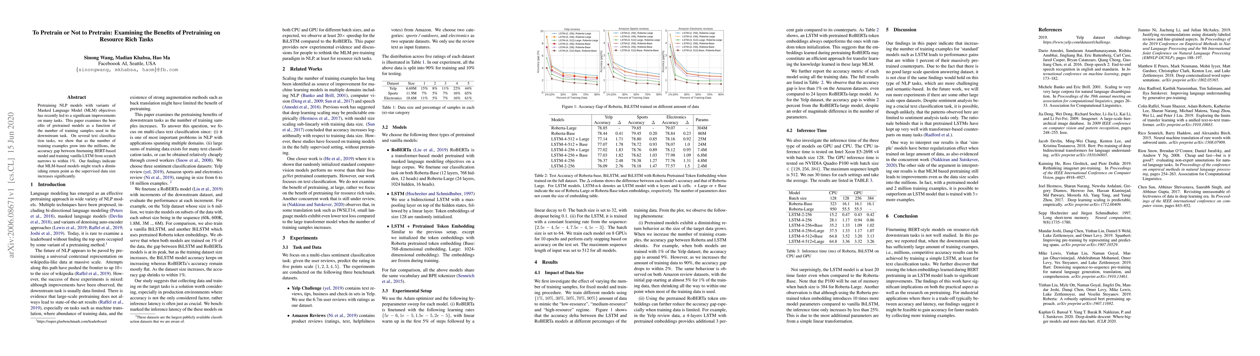 Pretraining NLP models with variants of Masked Language Model (MLM) objectives has recently led to a significant improvements on many tasks. This paper examines the benefits of pretrained models as a function of the number of training samples used in the downstream task. On several text classification tasks, we show that as the number of training examples grow into the millions, the accuracy gap between finetuning BERT-based model and training vanilla LSTM from scratch narrows to within 1%. Our findings indicate that MLM-based models might reach a diminishing return point as the supervised data size increases significantly.