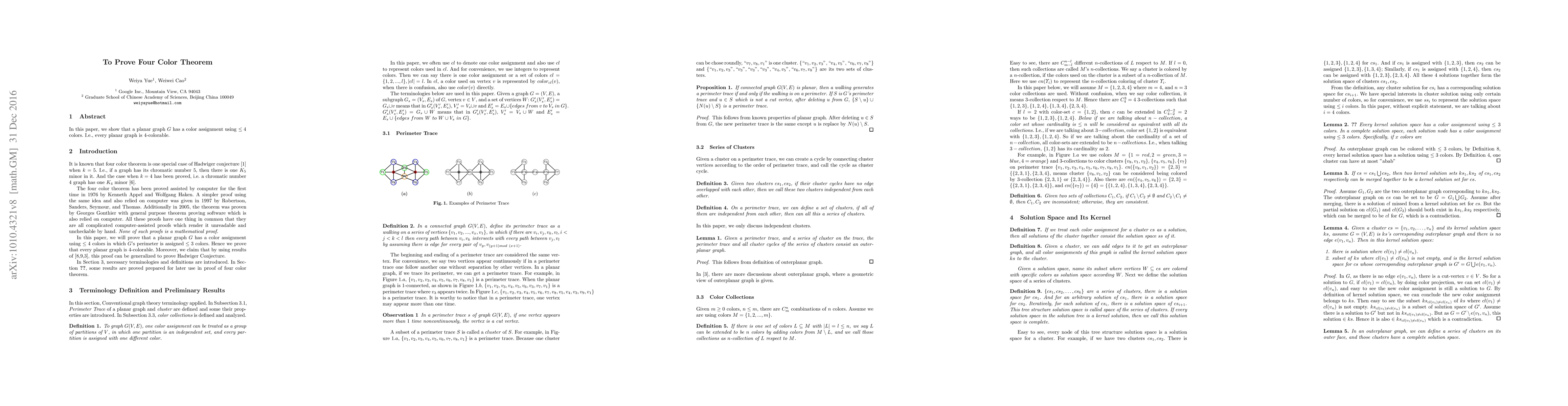 In this paper, we give a proof for four color theorem(four color conjecture). Our proof does not involve computer assistance and the most important is that it can be generalized to prove Hadwiger Conjecture. Moreover, we give algorithms to color and test planarity of planar graphs, which can be generalized to graphs containing $K_x(x>5)$ minor. There are four parts of this paper: Part-1: To Prove Four Color Theorem Part-2: An Equivalent Statement of Hadwiger Conjecture when $k=5$ Part-3: A New Proof of Wagner's Equivalence Theorem Part-4: A Geometric View of Outerplanar Graph