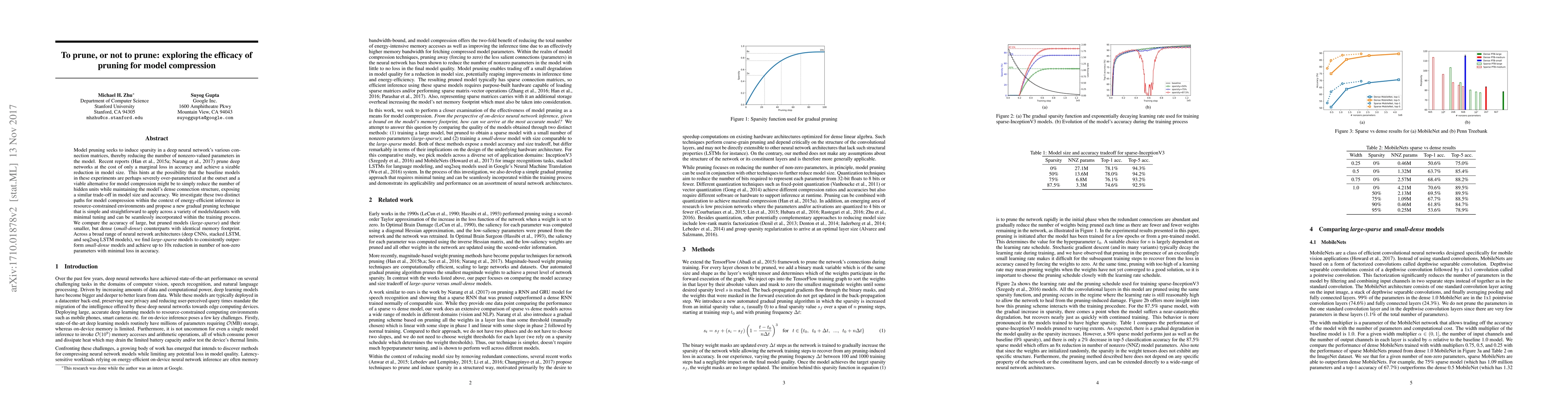 This paper explores the efficacy of model pruning versus reducing hidden units for neural network compression, finding that pruned models (large-sparse) outperform dense, smaller models (small-dense) in terms of accuracy and parameter efficiency, achieving up to 10x reduction in parameters with minimal loss in performance.