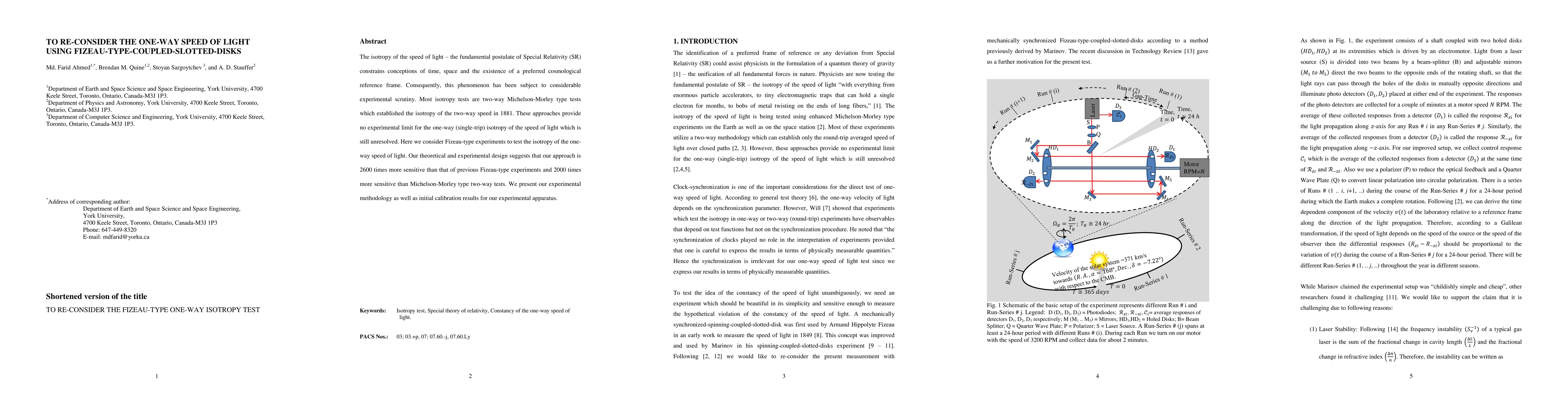 The isotropy of the speed of light - the fundamental postulate of Special Relativity (SR) constrains conceptions of time, space and the existence of a preferred cosmological reference frame. Consequently, this phenomenon has been subject to considerable experimental scrutiny. Most isotropy tests are two-way Michelson-Morley type tests which established the isotropy of the two-way speed in 1881. These approaches provide no experimental limit for the one-way (single-trip) isotropy of the speed of light which is still unresolved. Here we consider Fizeau-type experiments to test the isotropy of the one-way speed of light. Our theoretical and experimental design suggests that our approach is 2600 times more sensitive than that of previous Fizeau-type experiments and 2000 times more sensitive than Michelson-Morley type two-way tests. We present our experimental methodology as well as initial calibration results for our experimental apparatus.