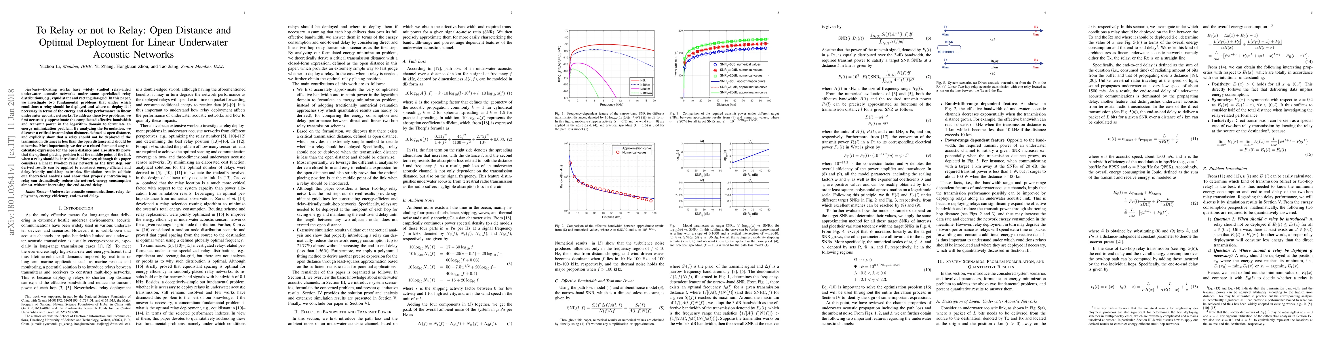 This paper investigates optimal relay deployment in linear underwater acoustic networks to minimize energy and reduce delay. It identifies a critical "open distance" beyond which relays should be used, and proves the optimal relay placement is at the midpoint, significantly reducing energy consumption with minimal delay.