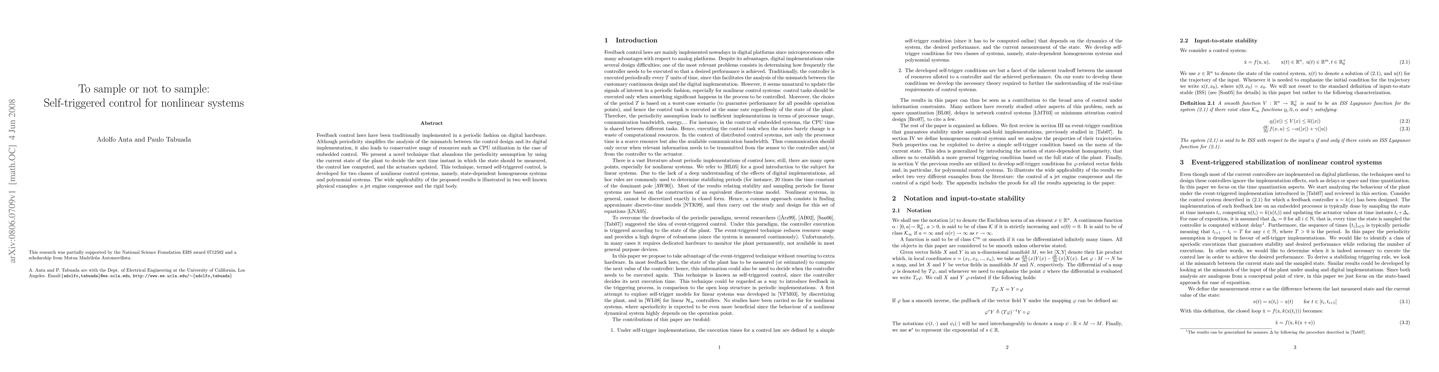 Feedback control laws have been traditionally implemented in a periodic fashion on digital hardware. Although periodicity simplifies the analysis of the mismatch between the control design and its digital implementation, it also leads to conservative usage of resources such as CPU utilization in the case of embedded control. We present a novel technique that abandons the periodicity assumption by using the current state of the plant to decide the next time instant in which the state should be measured, the control law computed, and the actuators updated. This technique, termed self-triggered control, is developed for two classes of nonlinear control systems, namely, state-dependent homogeneous systems and polynomial systems. The wide applicability of the proposed results is illustrated in two well known physical examples: a jet engine compressor and the rigid body.