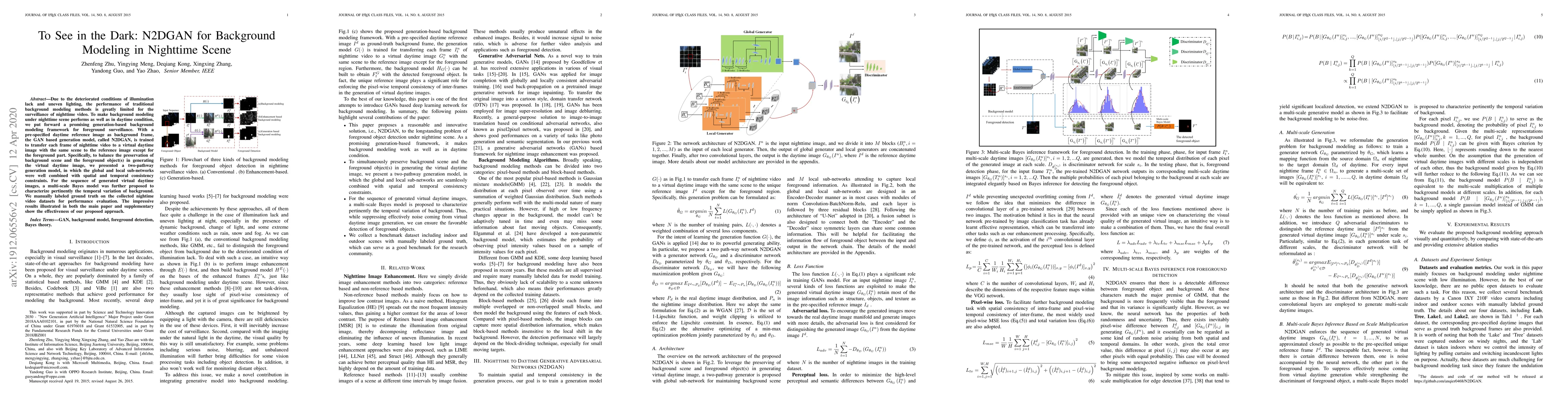 Researchers propose a new generation-based background modeling framework called N2DGAN to improve nighttime scene performance, using a GAN model trained on daytime reference images to generate virtual daytime images with preserved foreground objects.
