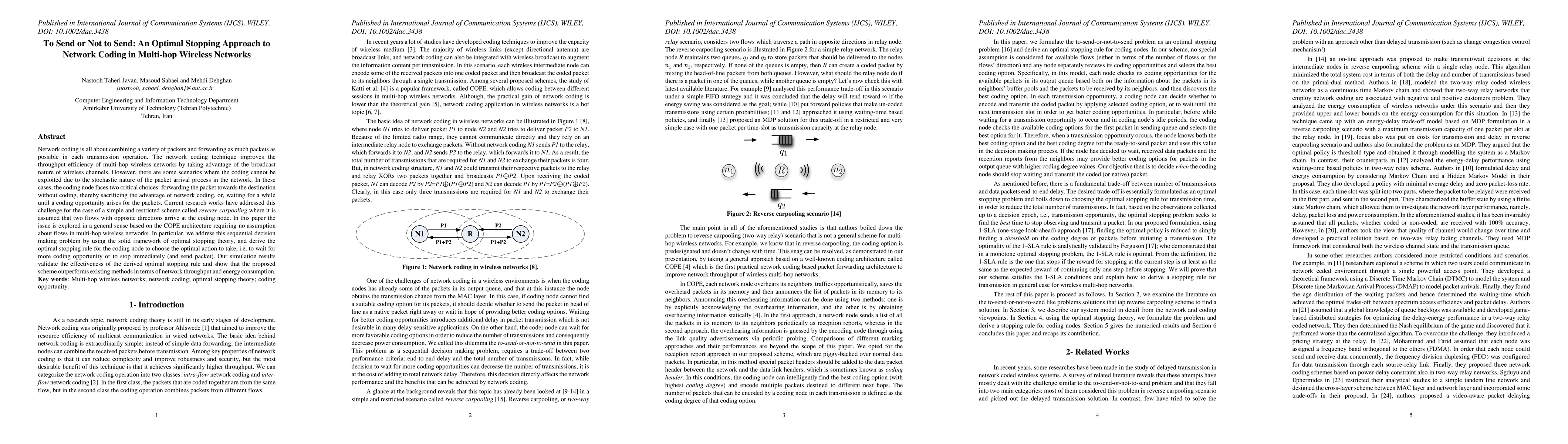 This paper proposes an optimal stopping approach to network coding in multi-hop wireless networks, addressing the dilemma of when to send packets without coding versus waiting for a coding opportunity. Using optimal stopping theory, it derives an optimal rule for coding nodes, leading to improved network throughput and energy efficiency compared to existing methods.