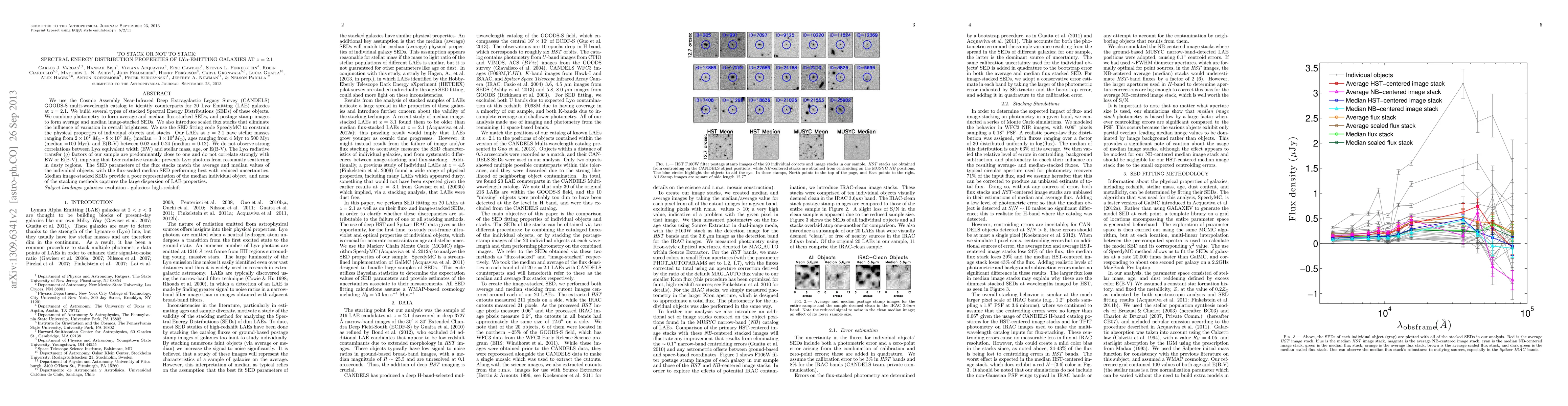 We use the Cosmic Assembly Near-Infrared Deep Extragalactic Legacy Survey (CANDELS) GOODS-S multi-wavelength catalog to identify counterparts for 20 Lya Emitting (LAE) galaxies at z=2.1. We build several types of stacked Spectral Energy Distributions (SEDs) of these objects. We combine photometry to form average and median flux-stacked SEDs, and postage stamp images to form average and median image-stacked SEDs. We also introduce scaled flux stacks that eliminate the influence of variation in overall brightness. We use the SED fitting code SpeedyMC to constrain the physical properties of individual objects and stacks. Our LAEs at z = 2.1 have stellar masses ranging from 2x10^7 Msun - 8x10^9 Msun (median = 3x10^8 Msun), ages ranging from 4 Myr to 500 Myr (median =100 Myr), and E(B-V) between 0.02 and 0.24 (median = 0.12). We do not observe strong correlations between Lya equivalent width (EW) and stellar mass, age, or E(B-V). The Lya radiative transfer (q) factors of our sample are predominantly close to one and do not correlate strongly with EW or E(B-V), implying that Lya radiative transfer prevents Lya photons from resonantly scattering in dusty regions. The SED parameters of the flux stacks match the average and median values of the individual objects, with the flux-scaled median SED performing best with reduced uncertainties. Median image-stacked SEDs provide a poor representation of the median individual object, and none of the stacking methods captures the large dispersion of LAE properties.