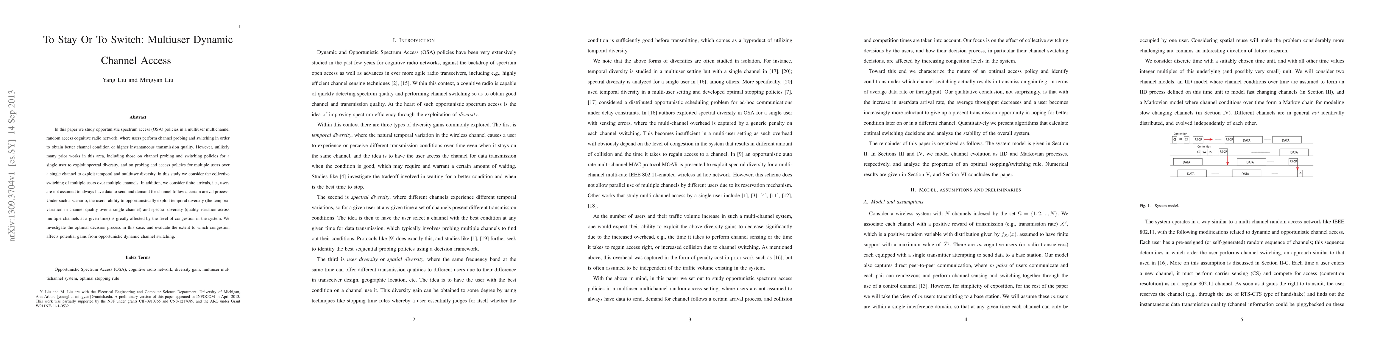 This paper investigates how congestion affects multiuser dynamic channel access in cognitive radio networks, where users switch channels to exploit spectral diversity. It finds that congestion impacts the potential gains from opportunistic switching, highlighting the need for efficient decision-making processes.