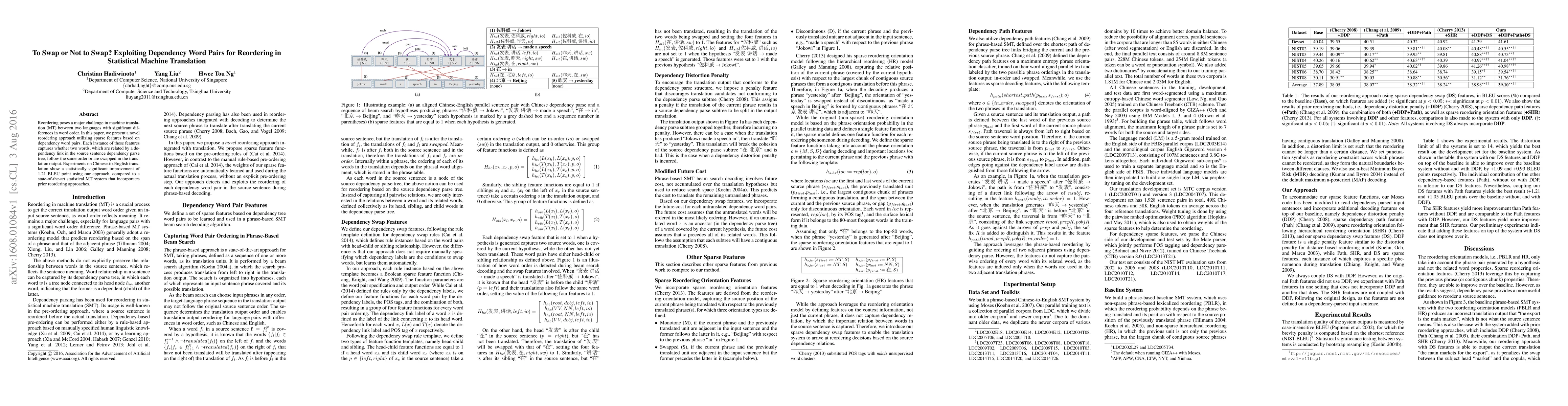 This paper introduces a novel reordering method for statistical machine translation that leverages dependency word pairs to address significant word order differences between languages. The approach shows a statistically significant 1.21 BLEU point improvement in Chinese-to-English translation compared to existing state-of-the-art systems.