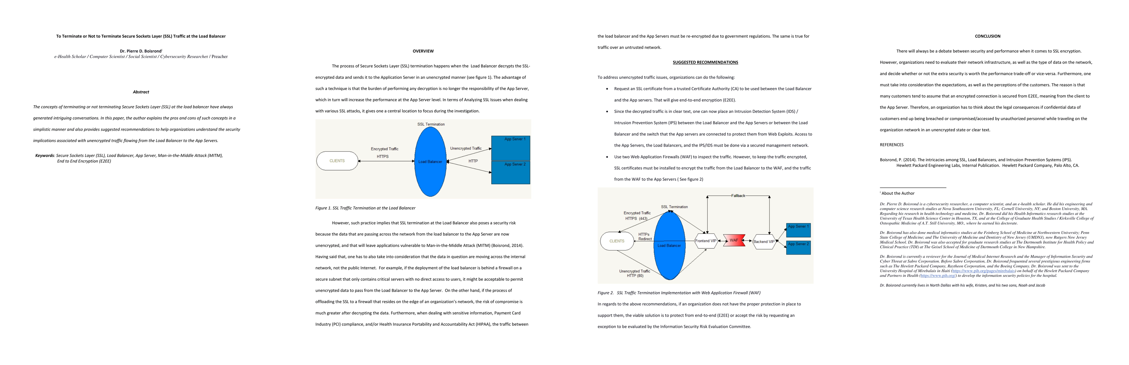Summary: This paper explores the security implications of terminating SSL at the load balancer versus allowing it to pass through, detailing both advantages and risks, including potential Man-in-the-Middle attacks, to guide organizations in making informed decisions about their encryption strategies.