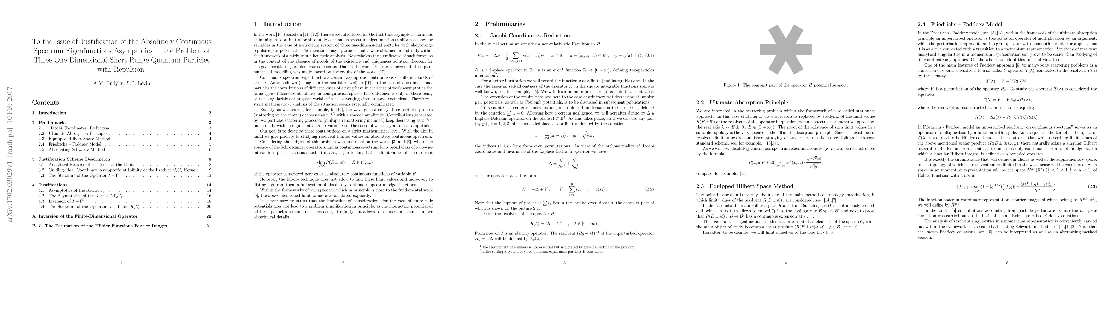 This paper justifies the asymptotic behavior of eigenfunctions associated with the absolutely continuous spectrum in a quantum mechanical system of three one-dimensional short-range particles experiencing repulsive interactions. The findings provide deeper insight into the spectral properties of such systems.