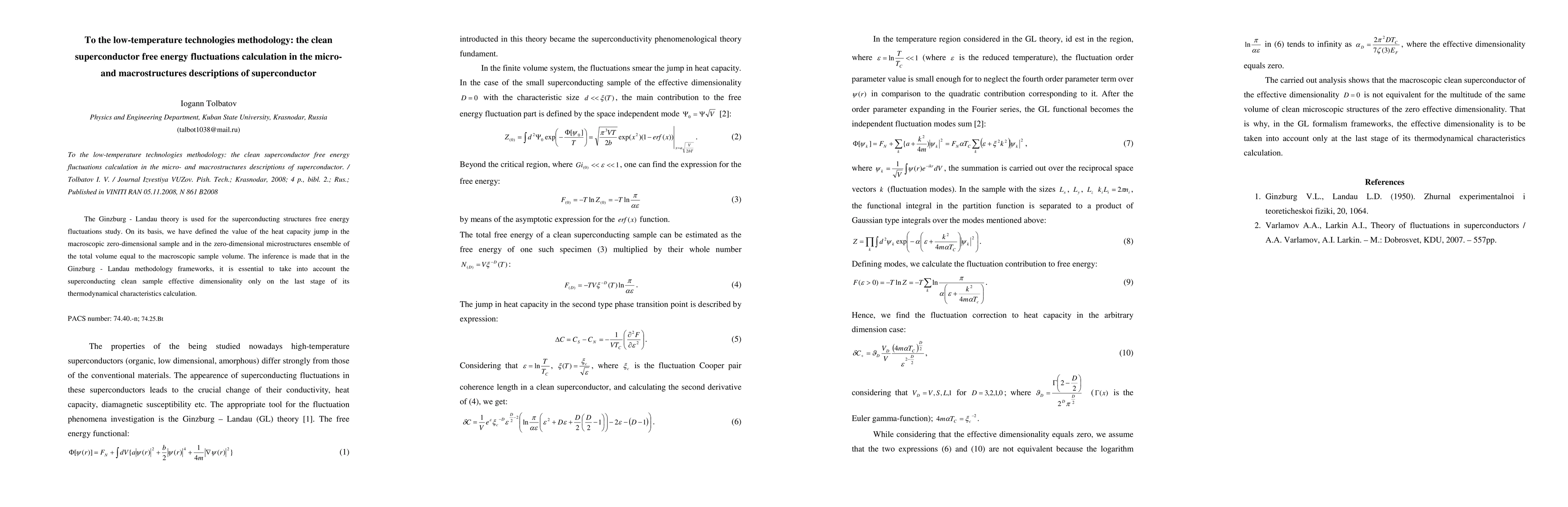 The Ginzburg - Landau theory is used for the superconducting structures free energy fluctuations study. On its basis, we have defined the value of the heat capacity jump in the macroscopic zero-dimensional sample and in the zero-dimensional microstructures ensemble of the total volume equal to the macroscopic sample volume. The inference is made that in the Ginzburg - Landau methodology frameworks, it is essential to take into account the superconducting clean sample effective dimensionality only on the last stage of its thermodynamical characteristics calculation.