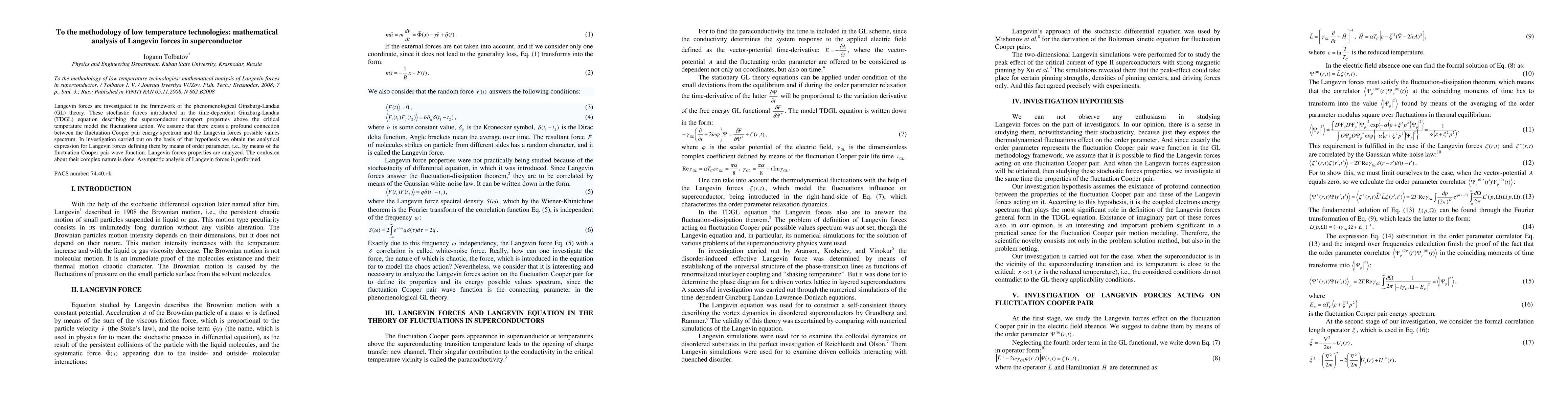 This research derives an analytical expression for Langevin forces in superconductors using the Ginzburg-Landau theory, defining them via the order parameter or fluctuating Cooper pair wave function. The study concludes that these forces have a complex nature, supported by asymptotic analysis.