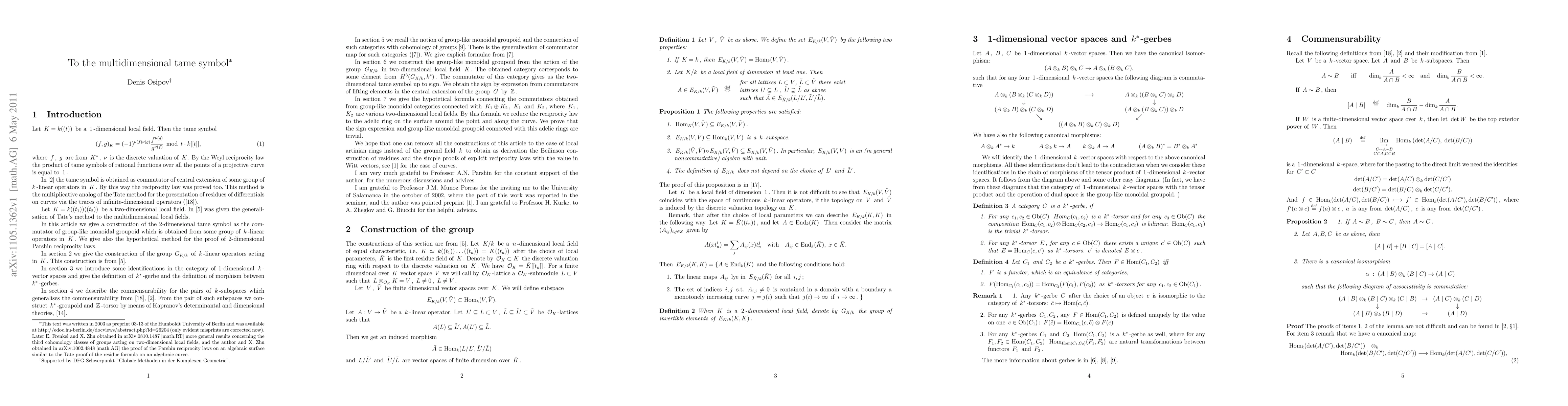 This paper constructs the two-dimensional tame symbol via the commutator of a group-like monoidal groupoid derived from k-linear operators in a two-dimensional local field, and proposes a method for proving the two-dimensional Parshin reciprocity laws. Later work by Frenkel and Zhu expanded on these results, and the author with Zhu proved the Parshin reciprocity laws on algebraic surfaces.