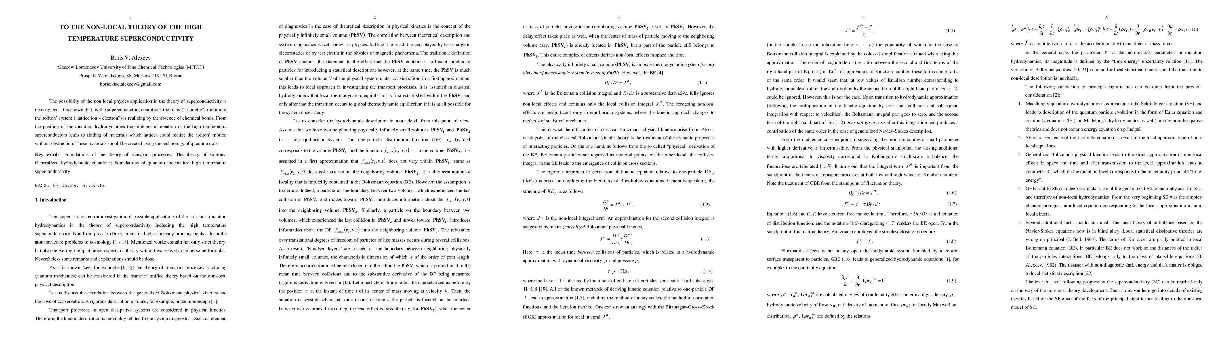 The possibility of the non local physics application in the theory of superconductivity is investigated. It is shown that by the superconducting conditions the relay ("estafette") motion of the soliton' system ("attice ion - electron") is realizing by the absence of chemical bonds. From the position of the quantum hydrodynamics the problem of creation of the high temperature superconductors leads to finding of materials which lattices could realize the soliton' motion without destruction. These materials should be created using the technology of quantum dots. Key words: Foundations of the theory of transport processes; The theory of solitons; Generalized hydrodynamic equations; Foundations of quantum mechanics; high temperature superconductivity.