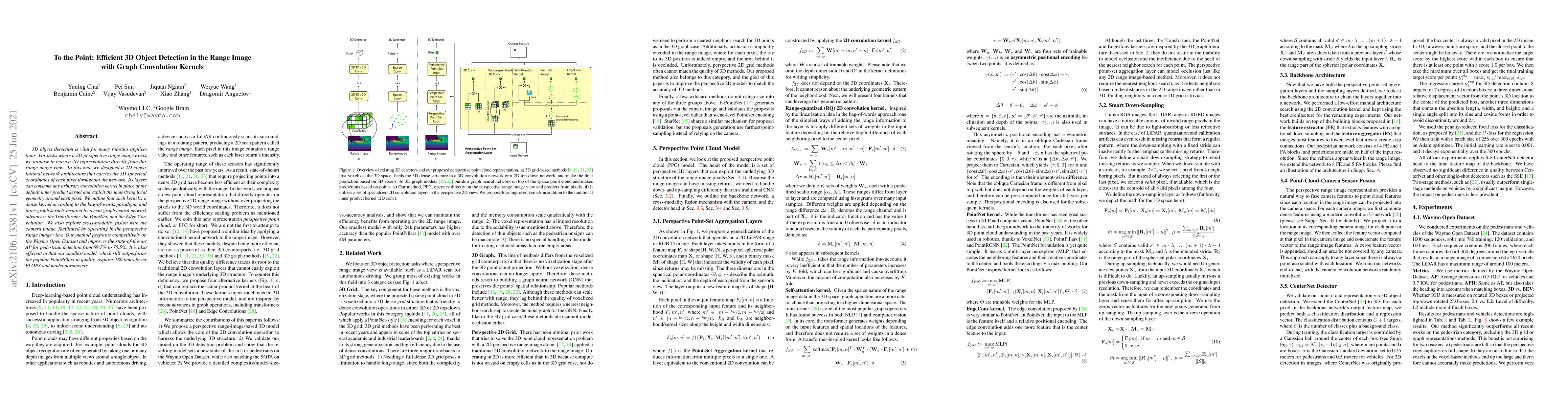 3D object detection is vital for many robotics applications. For tasks where a 2D perspective range image exists, we propose to learn a 3D representation directly from this range image view. To this end, we designed a 2D convolutional network architecture that carries the 3D spherical coordinates of each pixel throughout the network. Its layers can consume any arbitrary convolution kernel in place of the default inner product kernel and exploit the underlying local geometry around each pixel. We outline four such kernels: a dense kernel according to the bag-of-words paradigm, and three graph kernels inspired by recent graph neural network advances: the Transformer, the PointNet, and the Edge Convolution. We also explore cross-modality fusion with the camera image, facilitated by operating in the perspective range image view. Our method performs competitively on the Waymo Open Dataset and improves the state-of-the-art AP for pedestrian detection from 69.7% to 75.5%. It is also efficient in that our smallest model, which still outperforms the popular PointPillars in quality, requires 180 times fewer FLOPS and model parameters