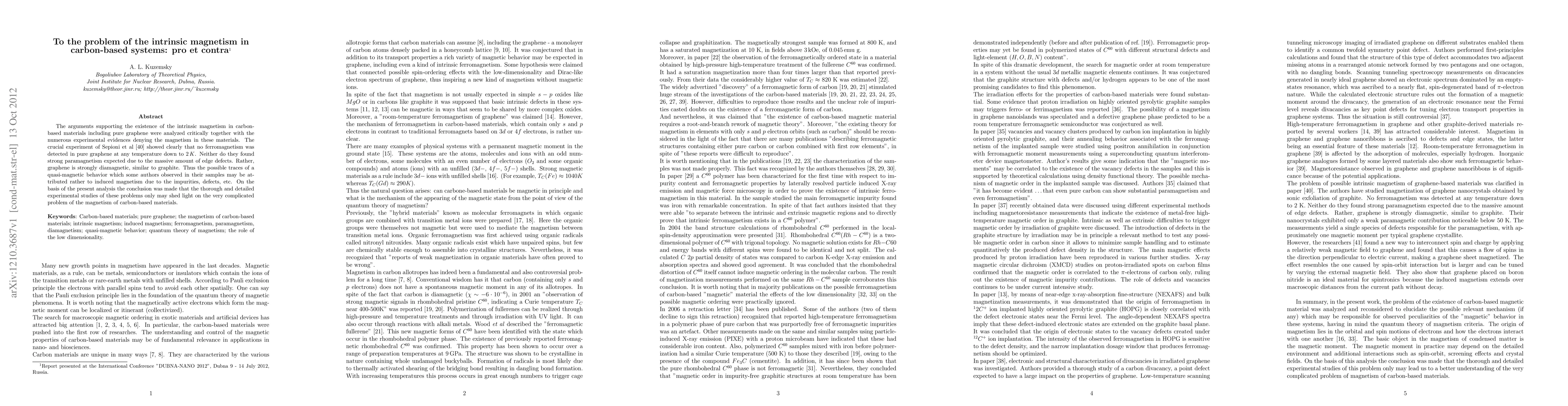 The arguments supporting the existence of the intrinsic magnetism in carbon-based materials including pure graphene were analyzed critically together with the numerous experimental evidences denying the magnetism in these materials. The crucial experiment of Sepioni et al (Phys.Rev.Lett., v.105 p.207205 (2010)) showed clearly that no ferromagnetism was detected in pure graphene at any temperature down to 2 K. Neither do they found strong paramagnetism expected due to the massive amount of edge defects. Rather, graphene is strongly diamagnetic, similar to graphite. Thus the possible traces of a quasi-magnetic behavior which some authors observed in their samples may be attributed rather to induced magnetism due to the impurities, defects, etc. On the basis of the present analysis the conclusion was made that the thorough and detailed experimental studies of these problems only may shed light on the very complicated problem of the magnetism of carbon-based materials.