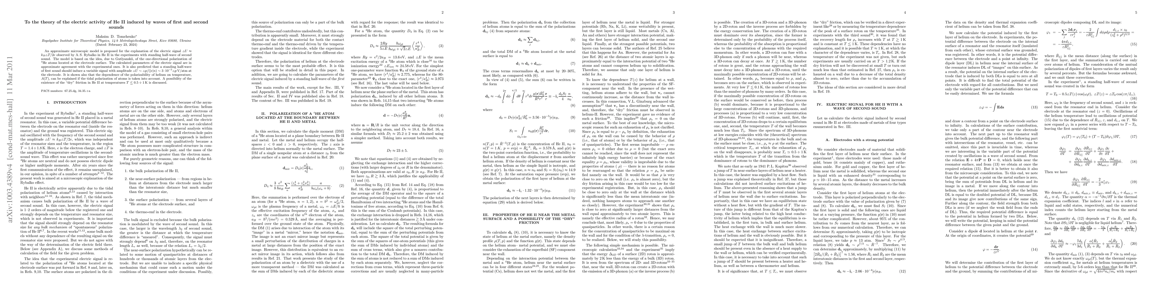 An approximate microscopic model is proposed for the explanation of the electric signal dU = k_B dT/(2e) observed by A.S. Rybalko in He II in the experiments with standing half-wave of second sound. The model is based on the idea, due to Gutlyanskii, of the one-directional polarization of He-4 atoms located at the electrode surface. The calculated parameters of the electric signal are in approximate agreement with the experimental ones. It is also predicted that a standing half-wave of first sound should induce a variable signal with amplitude dU ~ dp/(en) ~ 3*10^{-5} dp*V/atm at the electrode. It is shown also that the dependence of the polarizability of helium on temperature, A(T), can be explained if the tidal polarization of atoms is taken into account. A possibility of the existence of the "dry" friction in He II at temperatures T < 0.5-1 K is discussed.