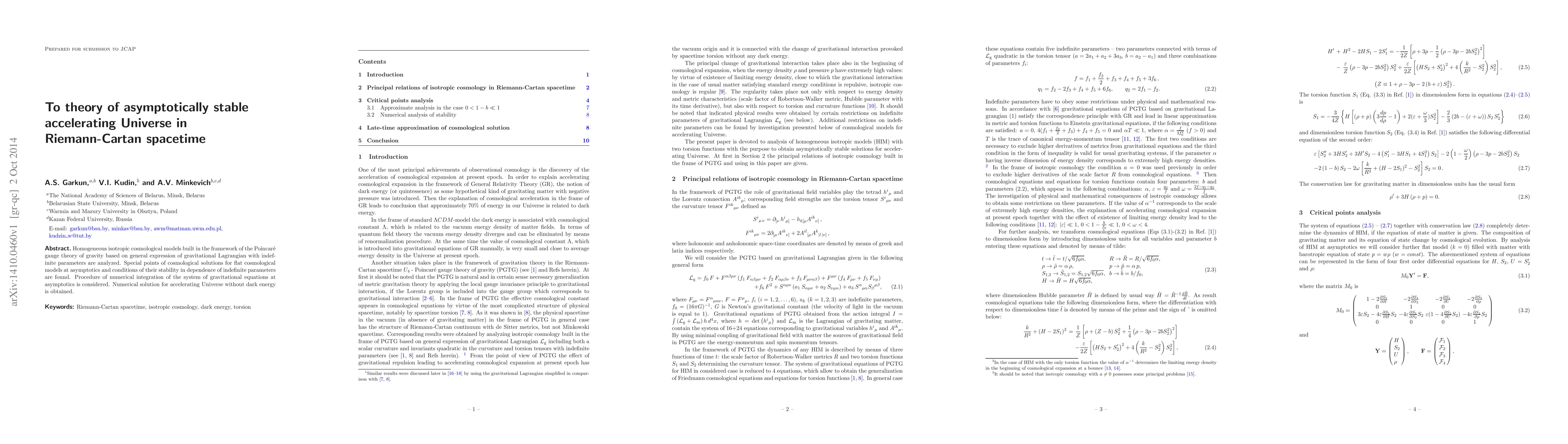 Researchers explored a theory of an asymptotically stable accelerating Universe in Riemann-Cartan spacetime, finding numerical solutions for flat cosmological models without dark energy.