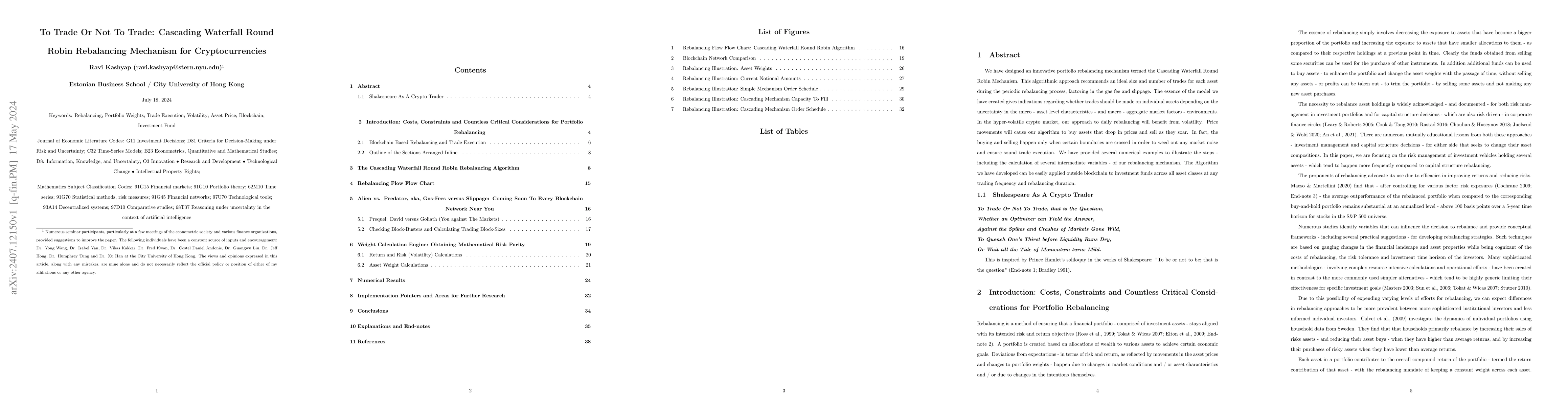 We have designed an innovative portfolio rebalancing mechanism termed the Cascading Waterfall Round Robin Mechanism. This algorithmic approach recommends an ideal size and number of trades for each asset during the periodic rebalancing process, factoring in the gas fee and slippage. The essence of the model we have created gives indications regarding whether trades should be made on individual assets depending on the uncertainty in the micro - asset level characteristics - and macro - aggregate market factors - environments. In the hyper-volatile crypto market, our approach to daily rebalancing will benefit from volatility. Price movements will cause our algorithm to buy assets that drop in prices and sell as they soar. In fact, the buying and selling happen only when certain boundaries are crossed in order to weed out any market noise and ensure sound trade execution. We have provided several numerical examples to illustrate the steps - including the calculation of several intermediate variables - of our rebalancing mechanism. The Algorithm we have developed can be easily applied outside blockchain to investment funds across all asset classes at any trading frequency and rebalancing duration. Shakespeare As A Crypto Trader: To Trade Or Not To Trade, that is the Question, Whether an Optimizer can Yield the Answer, Against the Spikes and Crashes of Markets Gone Wild, To Quench One's Thirst before Liquidity Runs Dry, Or Wait till the Tide of Momentum turns Mild.