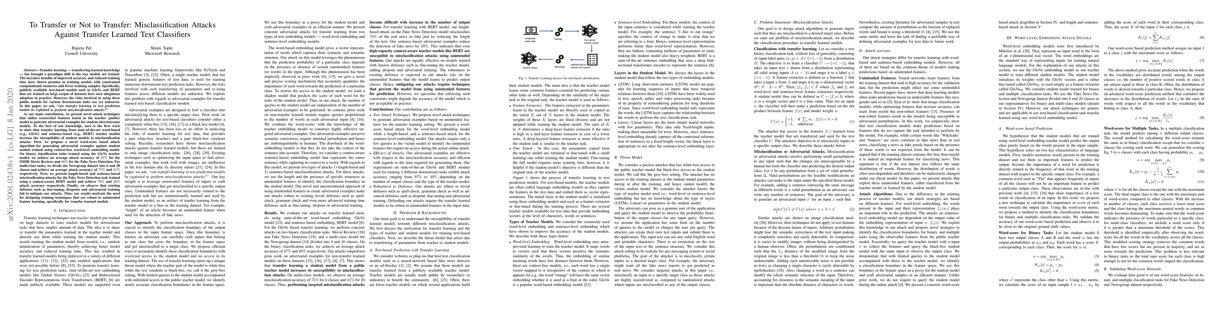Transfer learning --- transferring learned knowledge --- has brought a paradigm shift in the way models are trained. The lucrative benefits of improved accuracy and reduced training time have shown promise in training models with constrained computational resources and fewer training samples. Specifically, publicly available text-based models such as GloVe and BERT that are trained on large corpus of datasets have seen ubiquitous adoption in practice. In this paper, we ask, "can transfer learning in text prediction models be exploited to perform misclassification attacks?" As our main contribution, we present novel attack techniques that utilize unintended features learnt in the teacher (public) model to generate adversarial examples for student (downstream) models. To the best of our knowledge, ours is the first work to show that transfer learning from state-of-the-art word-based and sentence-based teacher models increase the susceptibility of student models to misclassification attacks. First, we propose a novel word-score based attack algorithm for generating adversarial examples against student models trained using context-free word-level embedding model. On binary classification tasks trained using the GloVe teacher model, we achieve an average attack accuracy of 97% for the IMDB Movie Reviews and 80% for the Fake News Detection. For multi-class tasks, we divide the Newsgroup dataset into 6 and 20 classes and achieve an average attack accuracy of 75% and 41% respectively. Next, we present length-based and sentence-based misclassification attacks for the Fake News Detection task trained using a context-aware BERT model and achieve 78% and 39% attack accuracy respectively. Thus, our results motivate the need for designing training techniques that are robust to unintended feature learning, specifically for transfer learned models.