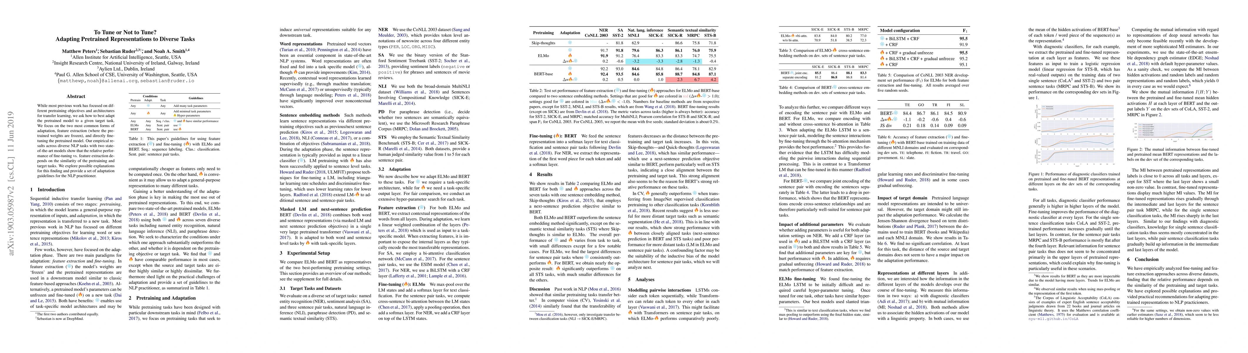 While most previous work has focused on different pretraining objectives and architectures for transfer learning, we ask how to best adapt the pretrained model to a given target task. We focus on the two most common forms of adaptation, feature extraction (where the pretrained weights are frozen), and directly fine-tuning the pretrained model. Our empirical results across diverse NLP tasks with two state-of-the-art models show that the relative performance of fine-tuning vs. feature extraction depends on the similarity of the pretraining and target tasks. We explore possible explanations for this finding and provide a set of adaptation guidelines for the NLP practitioner.