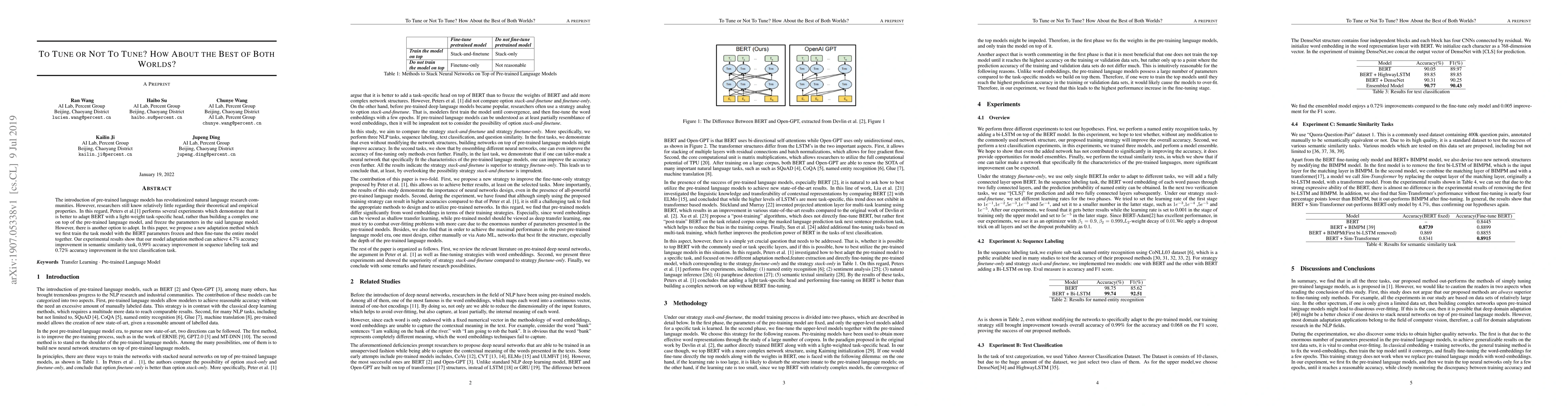 This paper proposes a hybrid adaptation method for pre-trained language models, initially training the task model with frozen BERT parameters followed by fine-tuning the entire model, achieving notable accuracy improvements across various NLP tasks. The method demonstrates a balance between tuning and non-tuning, outperforming traditional fine-tuning approaches.