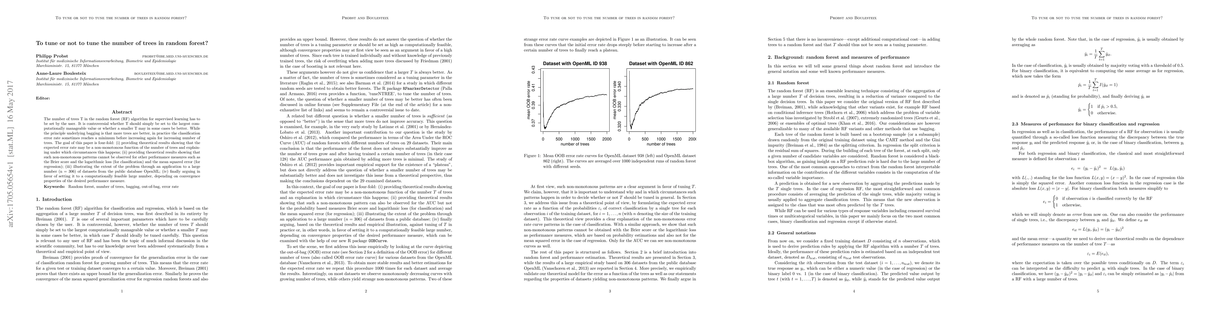 The number of trees T in the random forest (RF) algorithm for supervised learning has to be set by the user. It is controversial whether T should simply be set to the largest computationally manageable value or whether a smaller T may in some cases be better. While the principle underlying bagging is that "more trees are better", in practice the classification error rate sometimes reaches a minimum before increasing again for increasing number of trees. The goal of this paper is four-fold: (i) providing theoretical results showing that the expected error rate may be a non-monotonous function of the number of trees and explaining under which circumstances this happens; (ii) providing theoretical results showing that such non-monotonous patterns cannot be observed for other performance measures such as the Brier score and the logarithmic loss (for classification) and the mean squared error (for regression); (iii) illustrating the extent of the problem through an application to a large number (n = 306) of datasets from the public database OpenML; (iv) finally arguing in favor of setting it to a computationally feasible large number, depending on convergence properties of the desired performance measure.